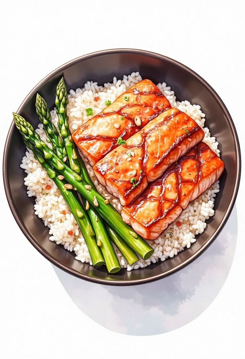 Food illustration style, elegant salmon rice bowl, grilled fish fillets, green asparagus, simple composition, gentle hues.