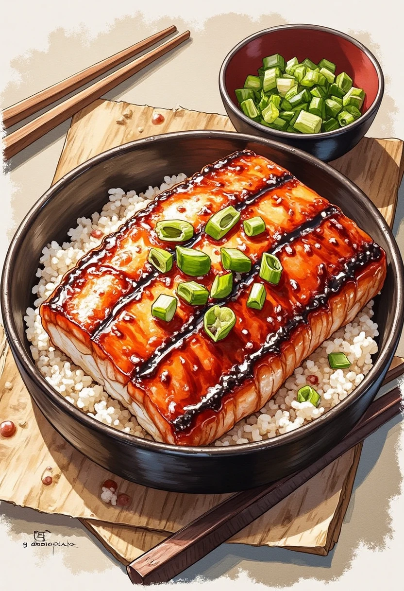 Food illustration style, classic unagi don, glazed eel over rice, scallions garnish, deep colors, traditional feel.