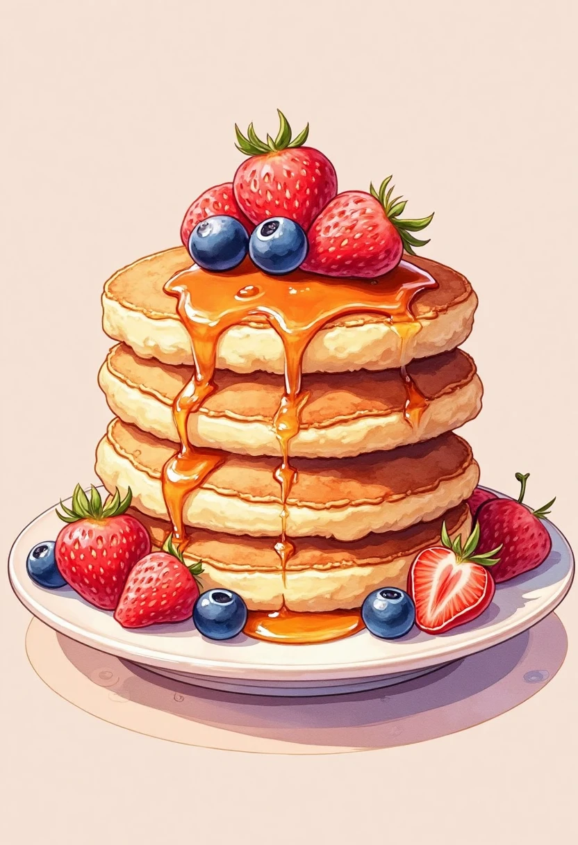 Food illustration style, breakfast set, fluffy pancakes, fresh berries, syrup drizzle, soft pastels, cozy vibe.