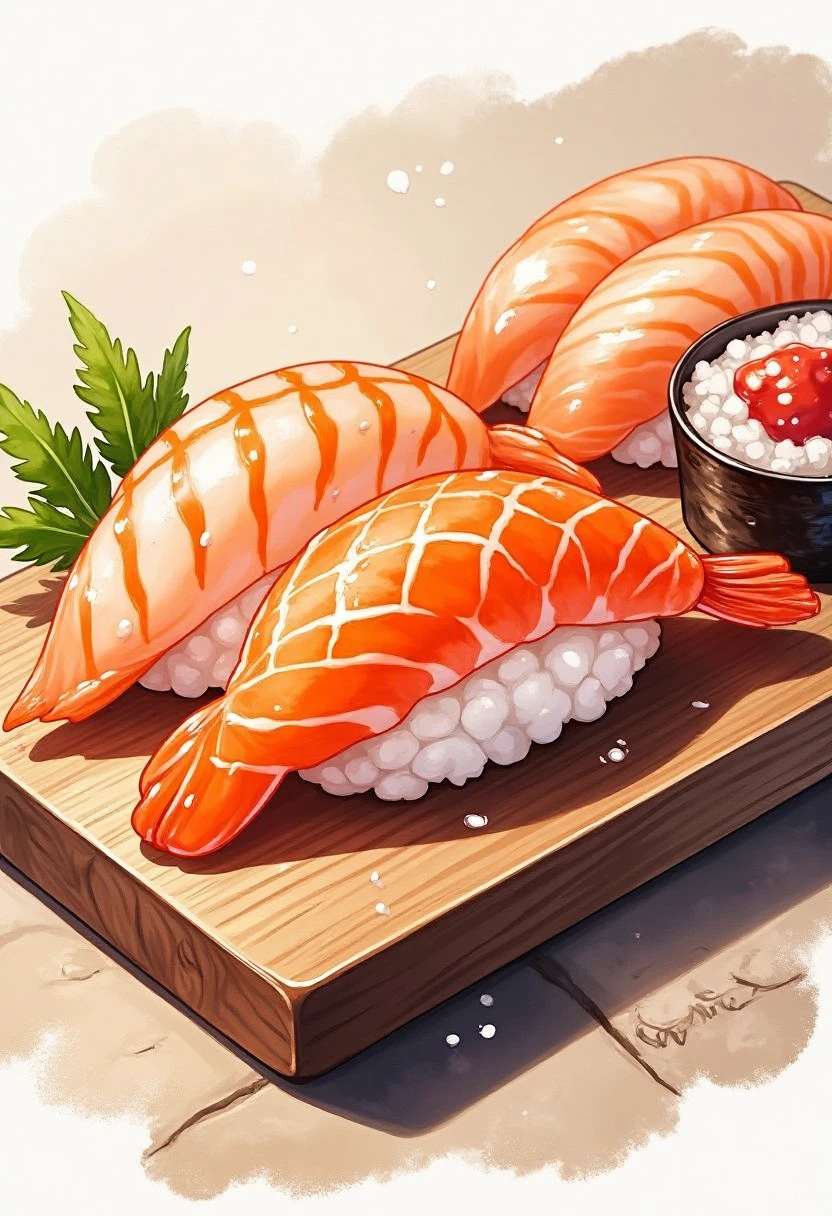 Food illustration style, delicate sushi platter, shrimp and salmon nigiri, wooden board, soft lighting, smooth surfaces.