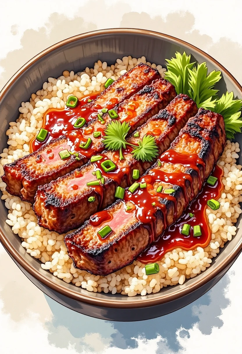 Food illustration style, fusion rice bowl, grilled meat with unique sauce, mixed grains, modern design, bold colors.