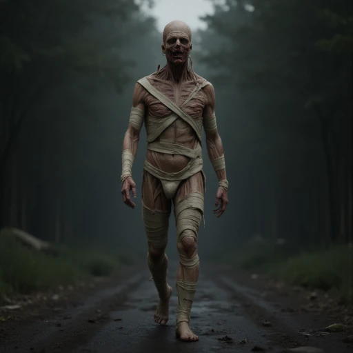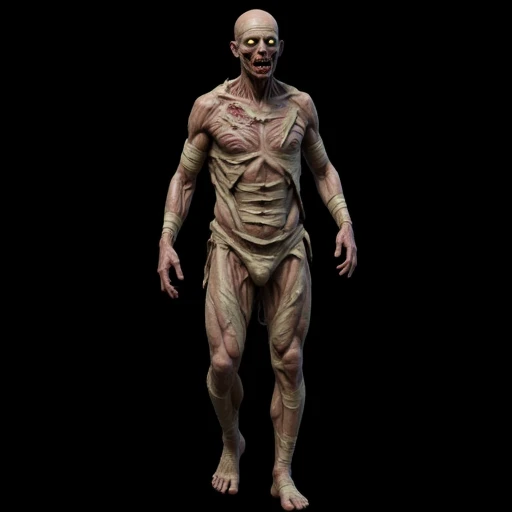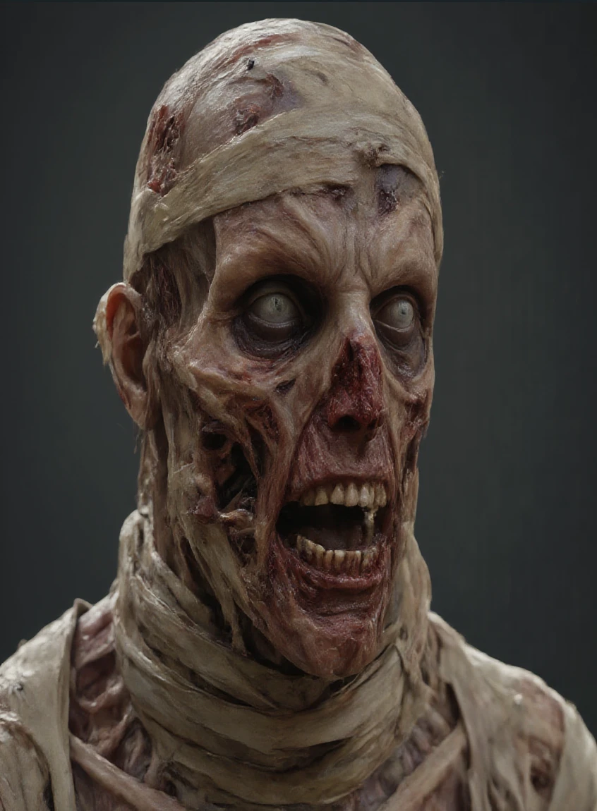 zombie, mummy, rotting, flesh, gore, guro, teeth, bandages, open mouth, blood, veins, detailed,