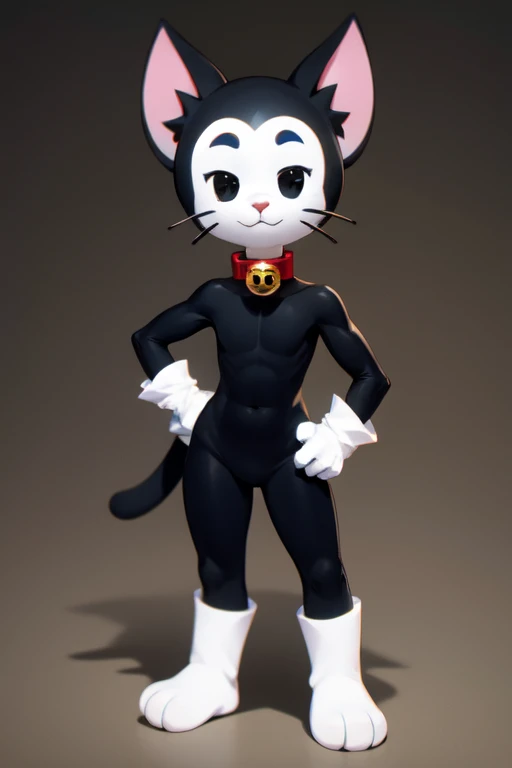 kitBS, solo, 1boy, furry, cat boy, black skin, white face, black eyes, collar, bell, white gloves, white paws