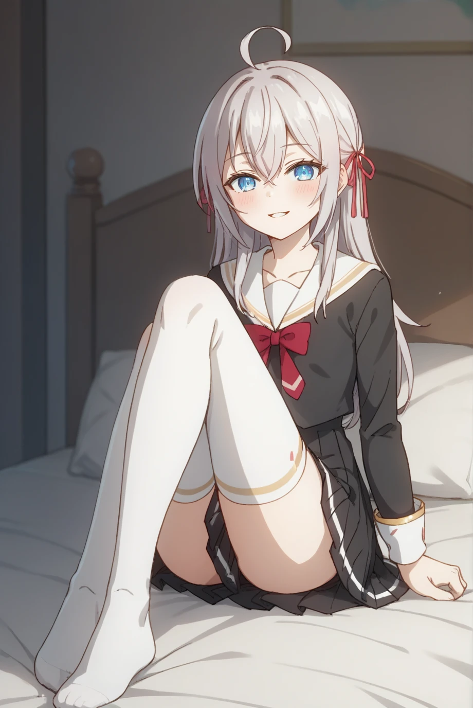 <lora:MikhailovnaXL-v1-07:0.7>, ChopioAlisa, grey hair, long hair, ahoge, hair between eyes, crossed bangs, blue eyes, looking at viewer,Outfit 1 (School Uniform):