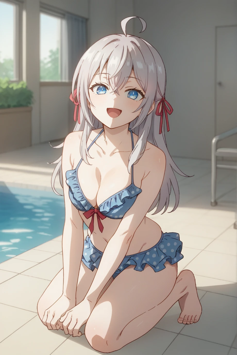 hair ribbon, outfit_2, polka dot, blue bikini, frilled bikini, bikini skirt,