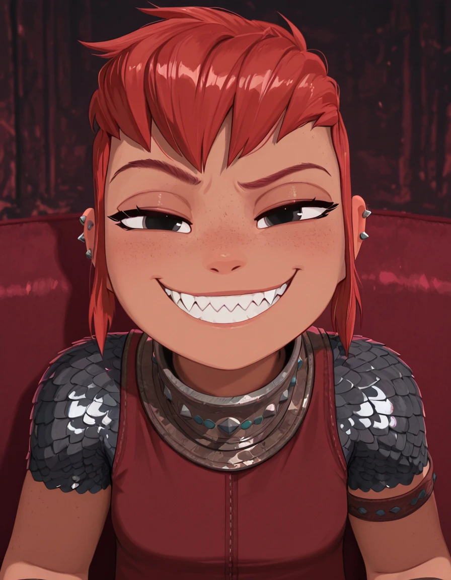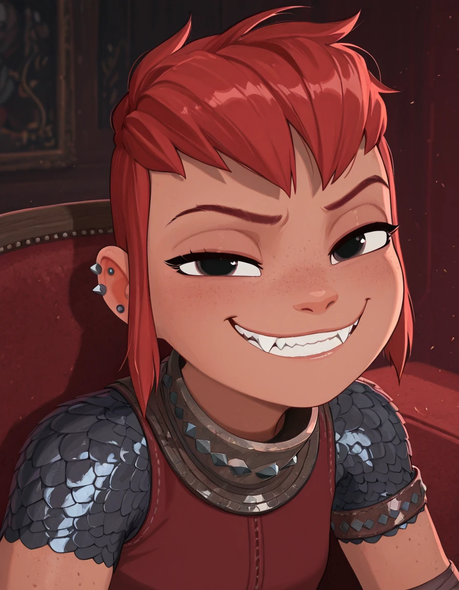 nimona, red hair, short hair, long side locks, black eyes, ear piercing, armband wraps, red tank top, gorget, scalemail undershirt, purple skirt, leather belt, scalemail shorts, brown boots