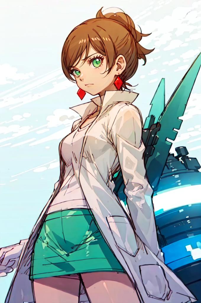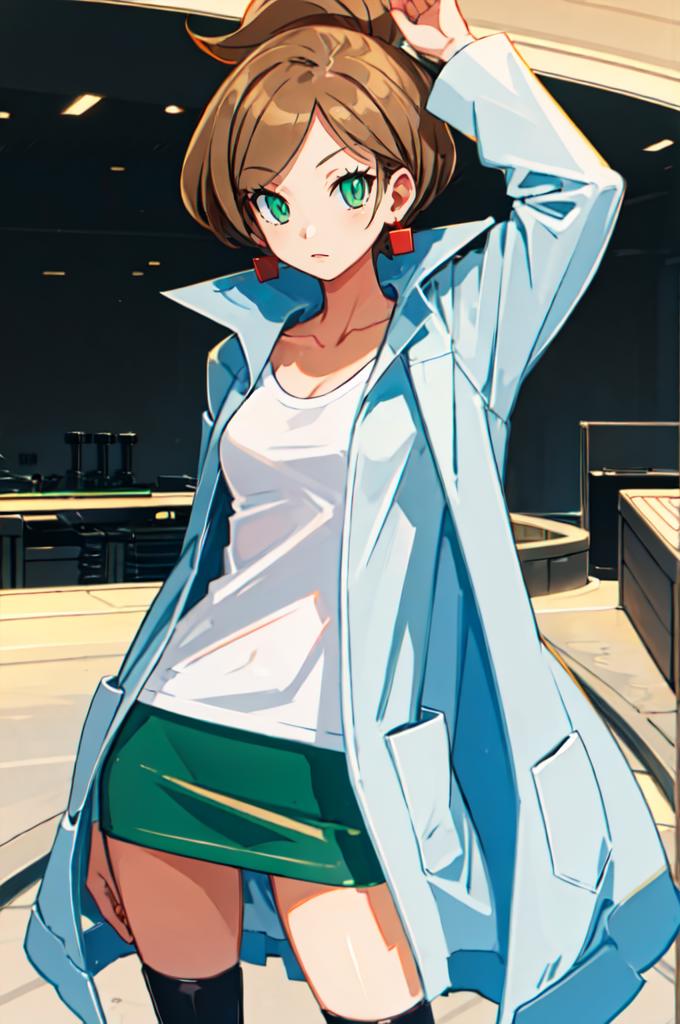 Outfit: lab coat, white shirt, green skirt