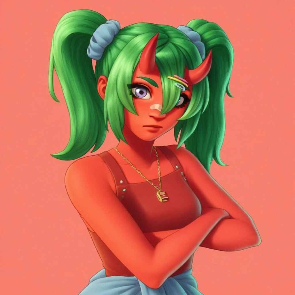 Nemia, red skin, green hair, twin tails, hair between eyes, lilac eyes, bandaid on nose, horns