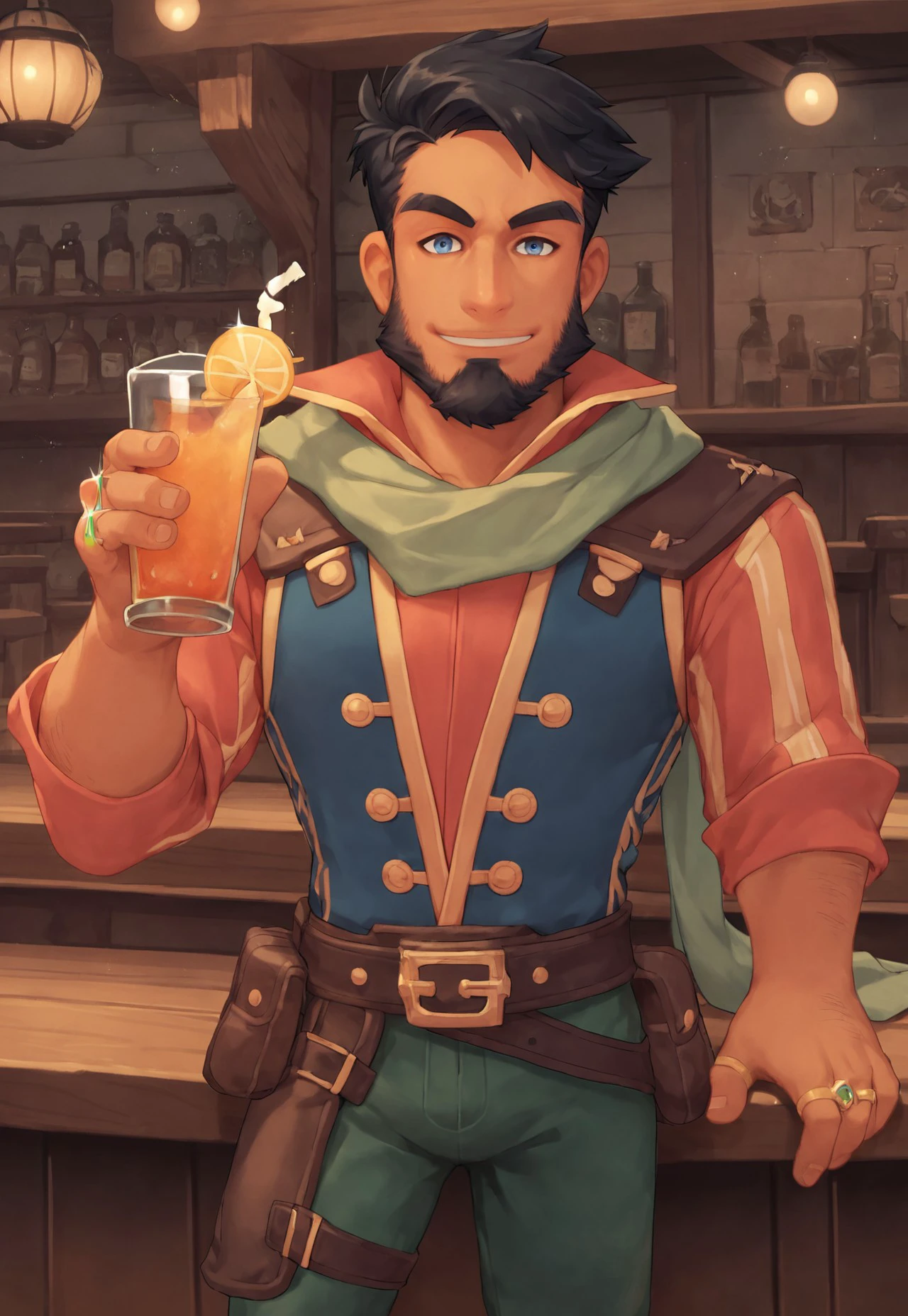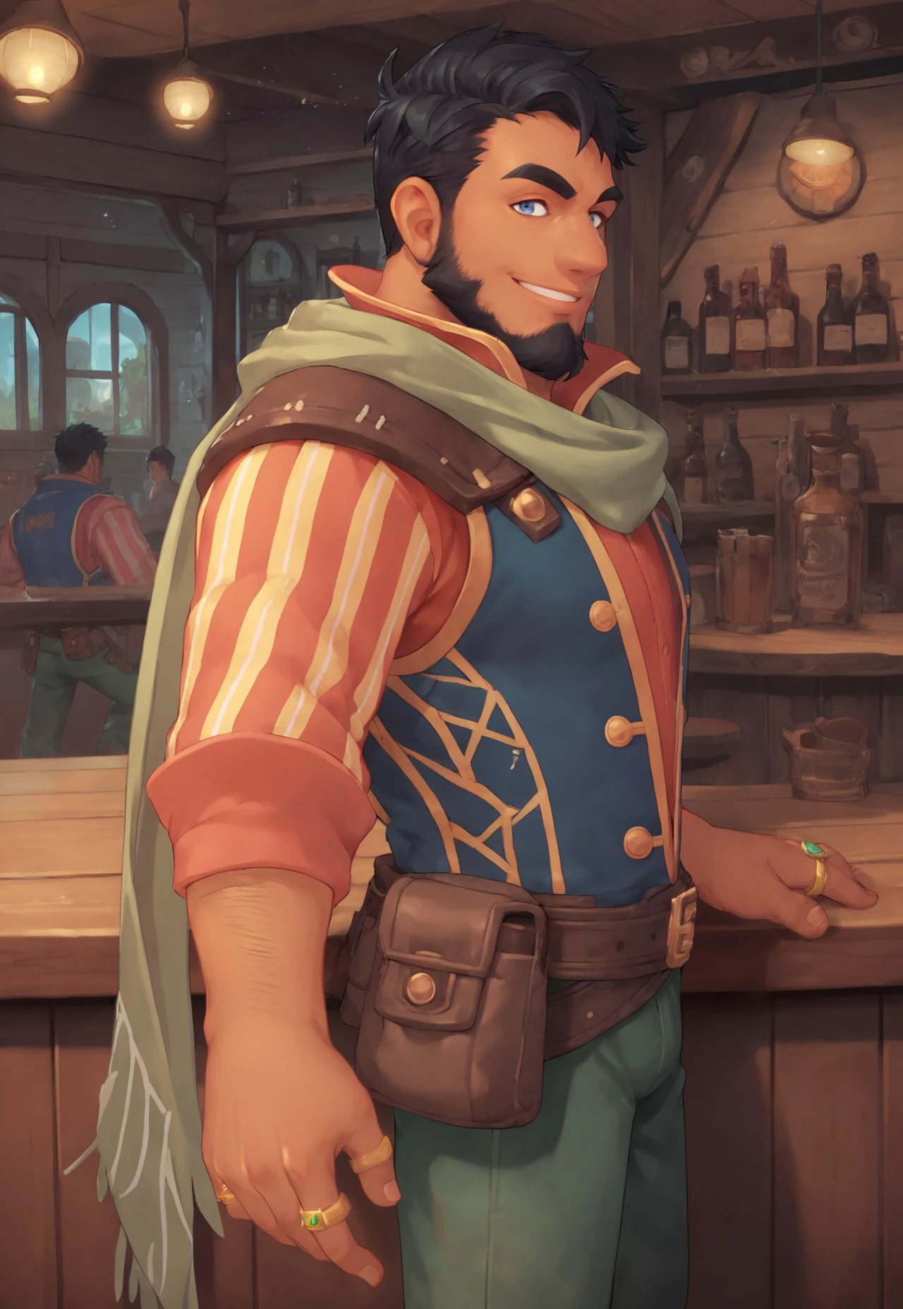 ADDITIONAL TAGS: black hair, beard, facial hair, blue eyes, scarf, shirt, vest, green pants, belt, boots, pouch, ring,