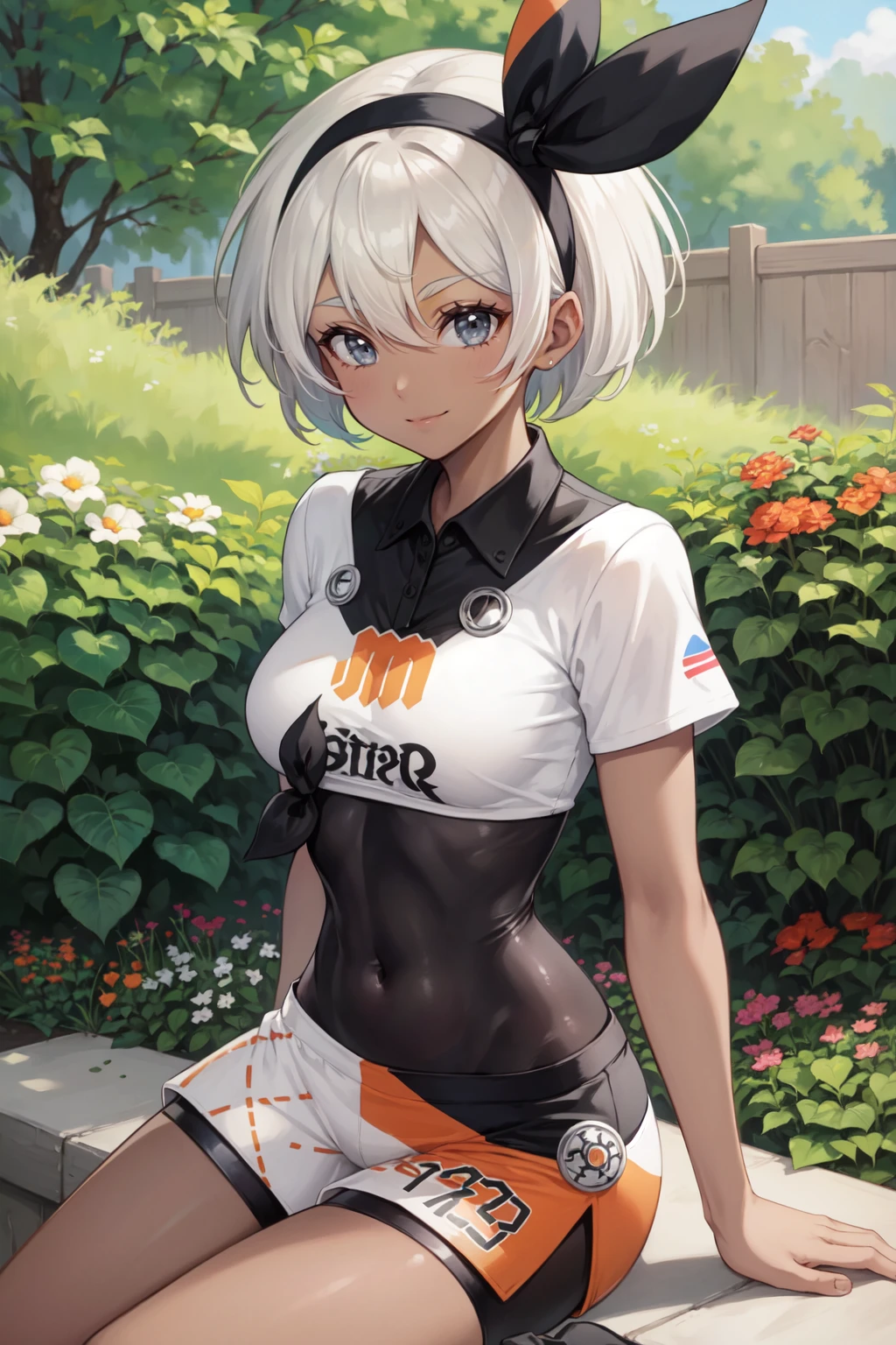 bea, short hair, hairband, dark skin, dark-skinend female, black hairband, hair between eyes, bow hairband, shirt, short sleeves, bodysuit, black bodysuit, shorts, gloves, bodysuit under clothes, collared shirt