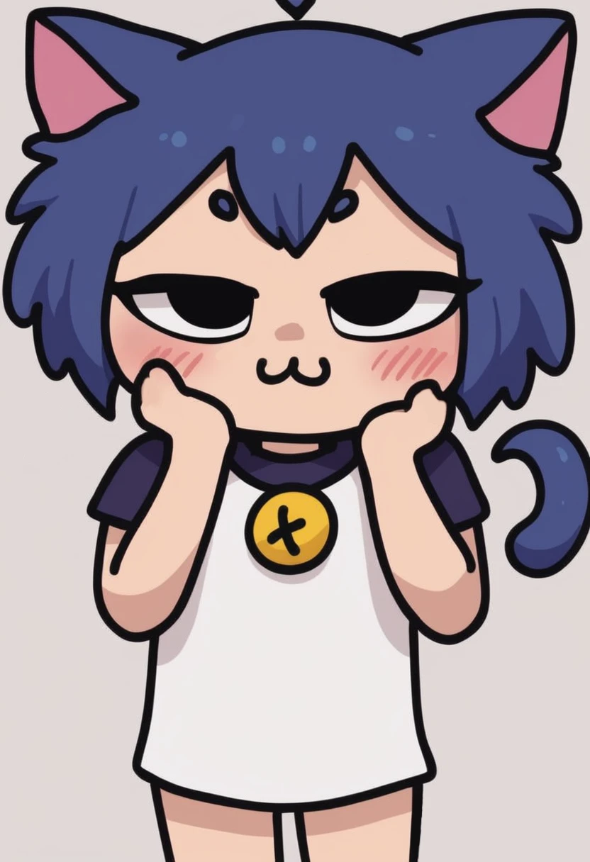 donte_pront, milshoo, tail, detached tail, blue hair, blue heart above head, ahoge, cat ears, short hair,big eyes, eyes without irises, aniridia, drawing, cartoon style, chibi, eyebrows, cheeks, catgirl, cat whiskers,