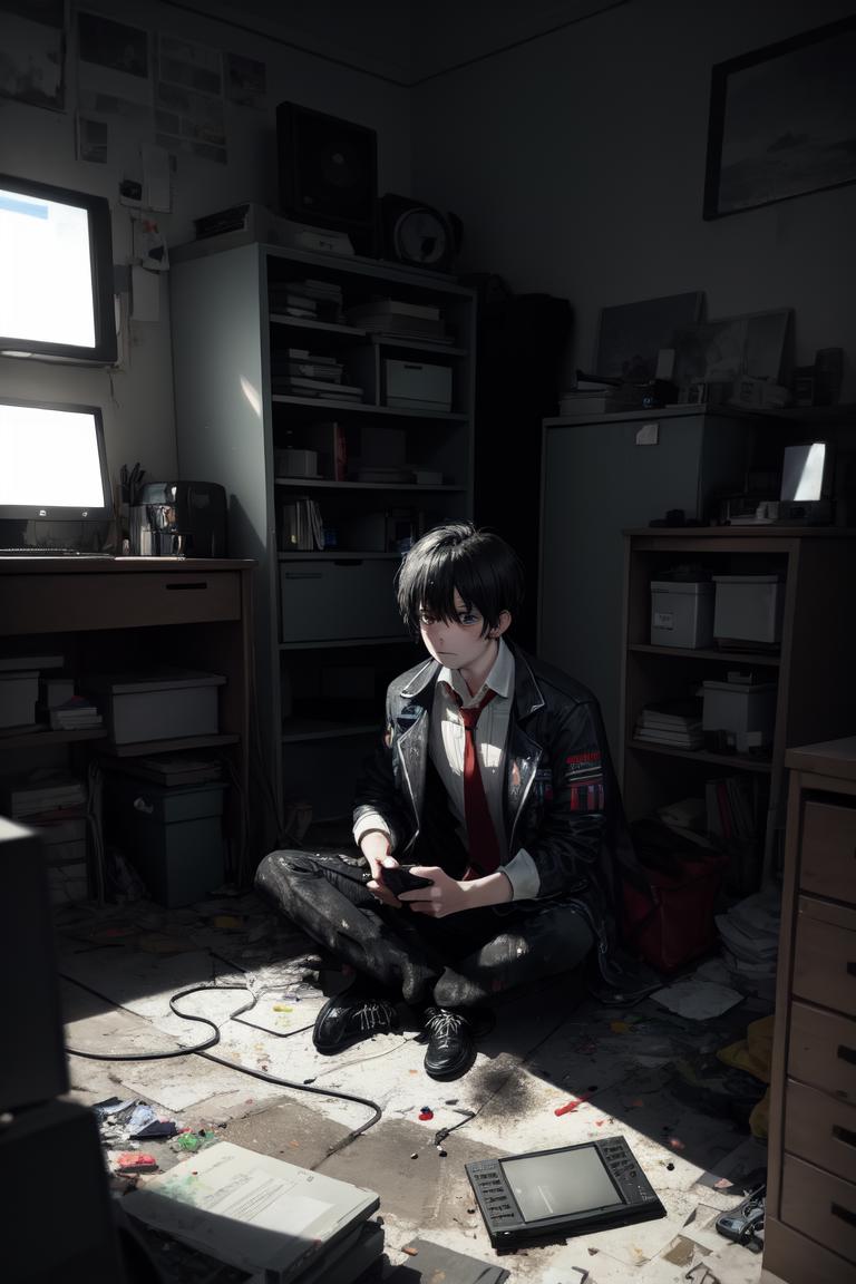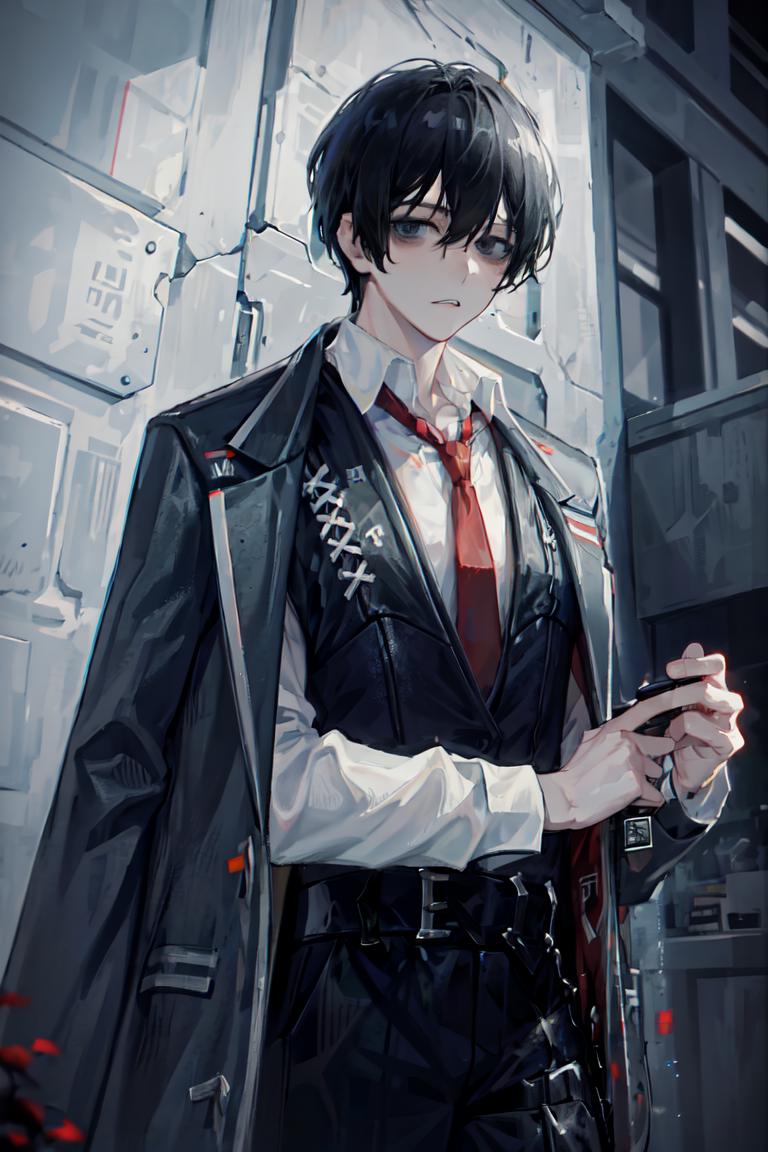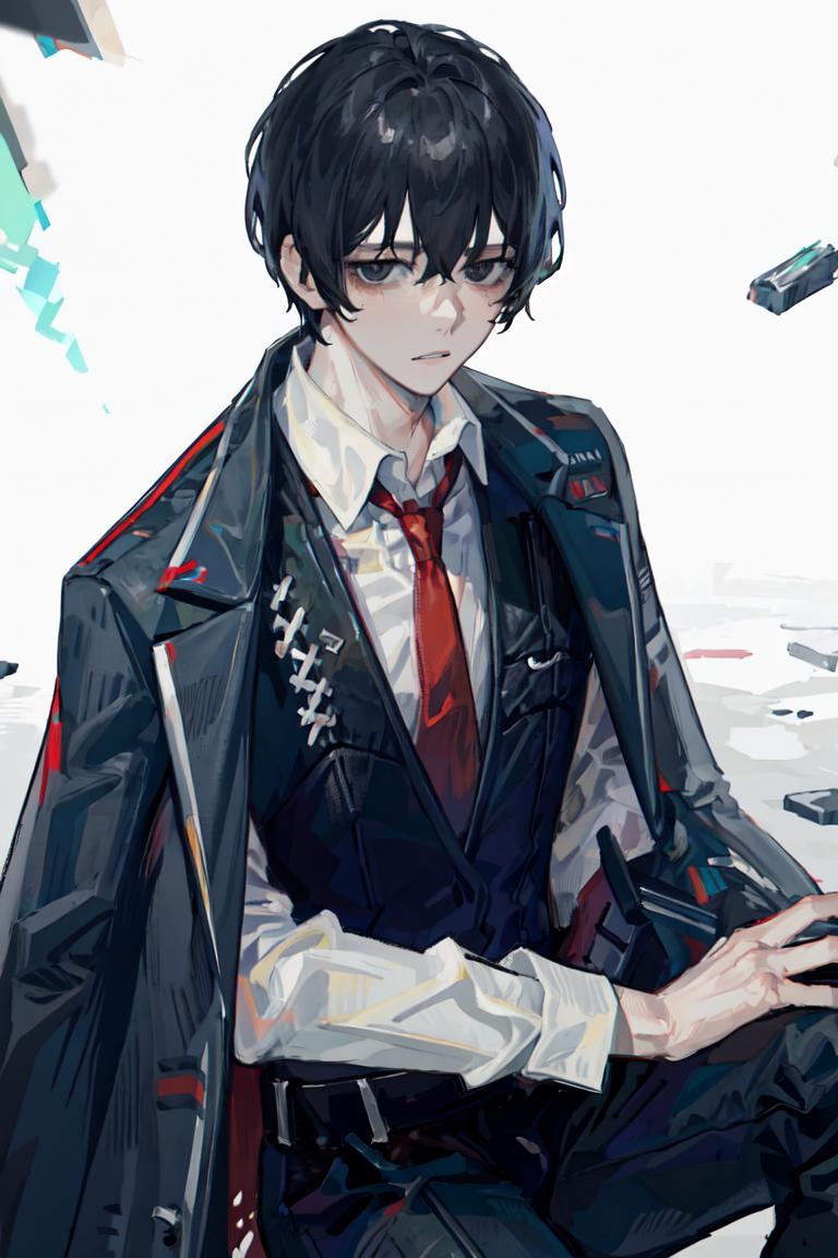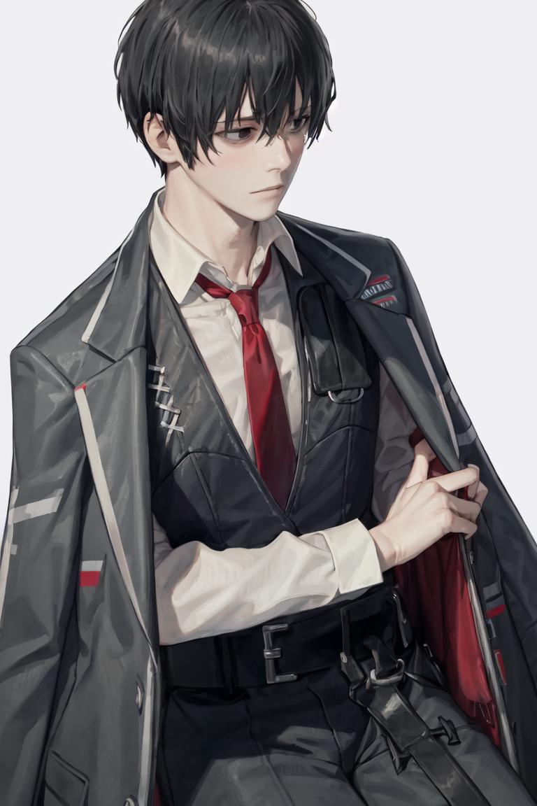 For his formal wear, use default_outfit, red necktie, white shirt, collared shirt, black pants, black vest, black jacket, jacket on shoulders