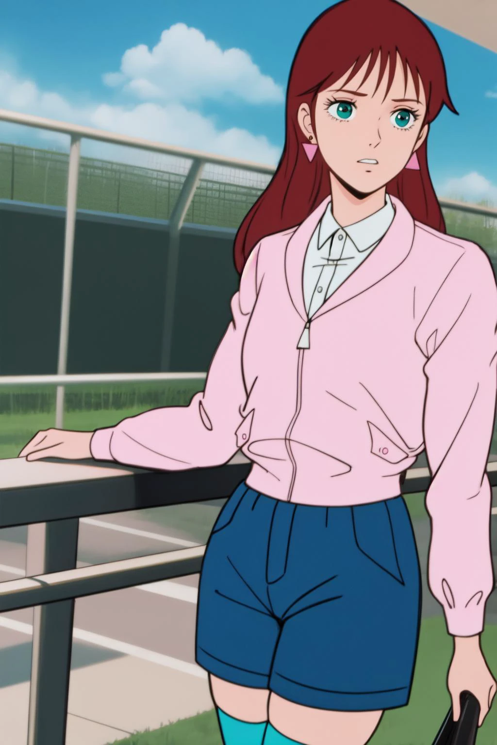 Outfit 1: nas1, 1girl, solo, gloruniform, jacket, shorts, thighhighs, jewelry, earrings, large breasts