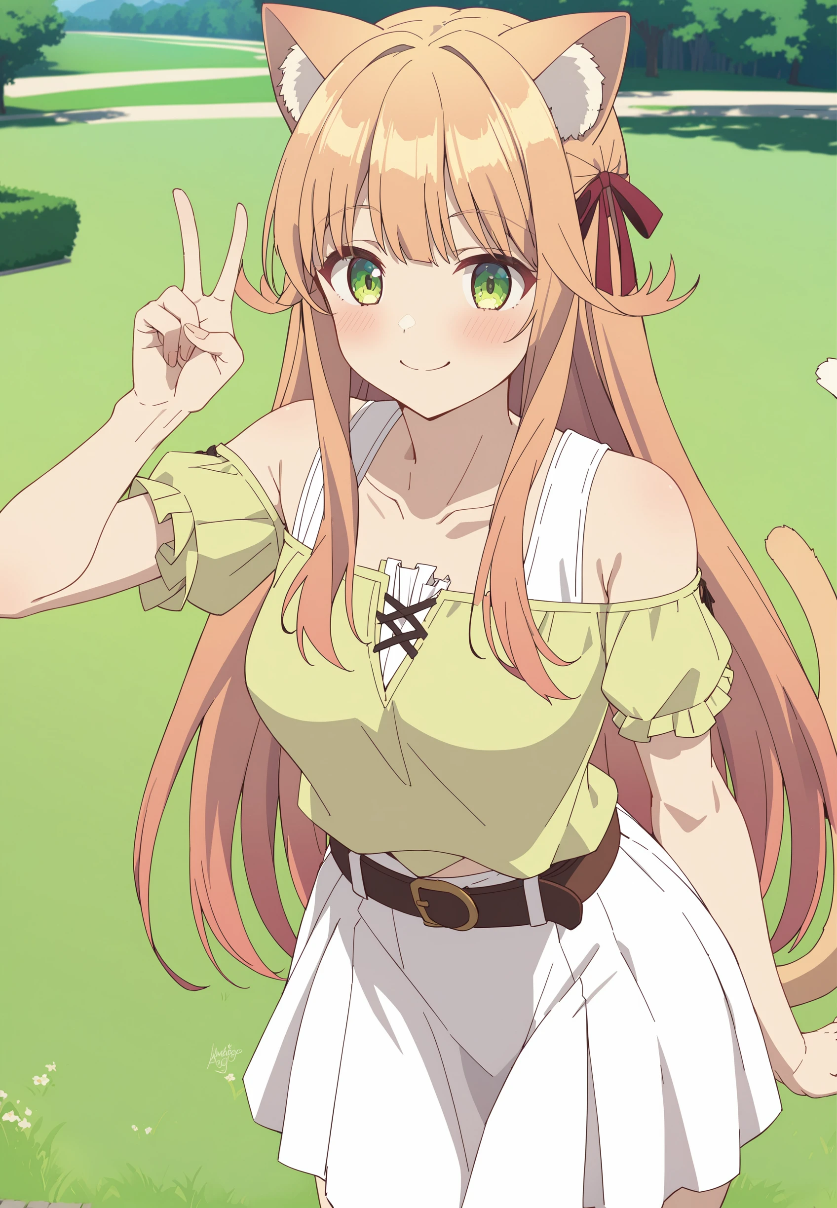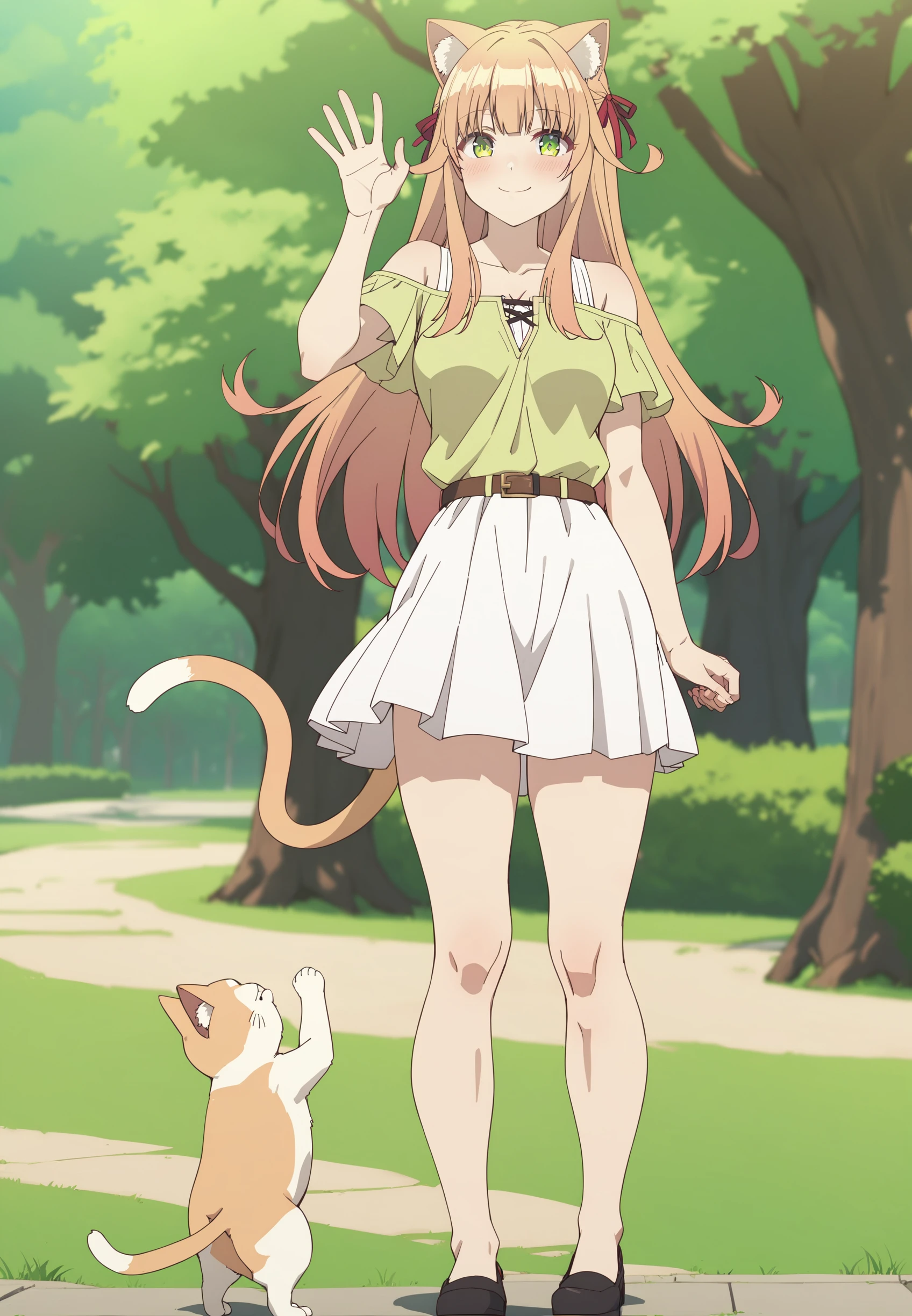 Outfit : cat tail, bare shoulders, green shirt, short sleeves, white skirt, brown belt, black shoes,