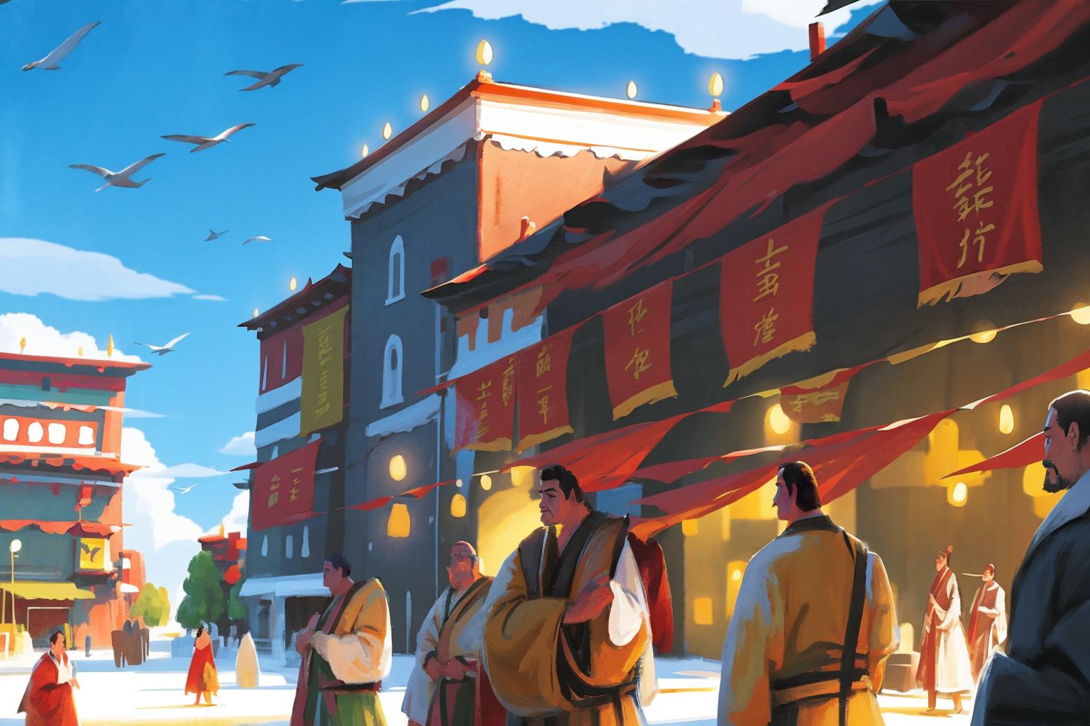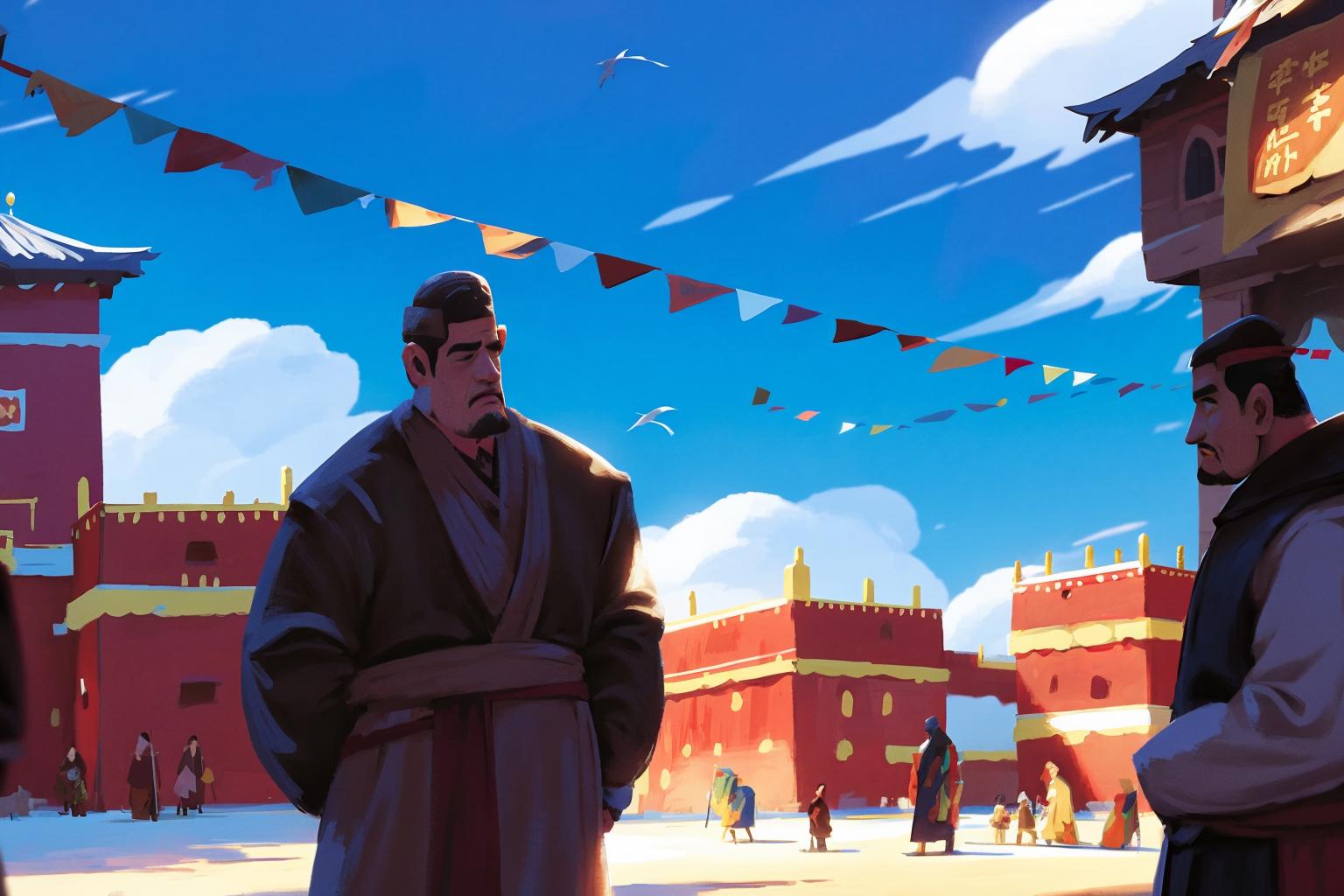 正向关键词举例:插图, 手绘纹理, 中国传统绘画, 多个男孩, 长发, 鸟, 黑发, 长袖, 旗帜