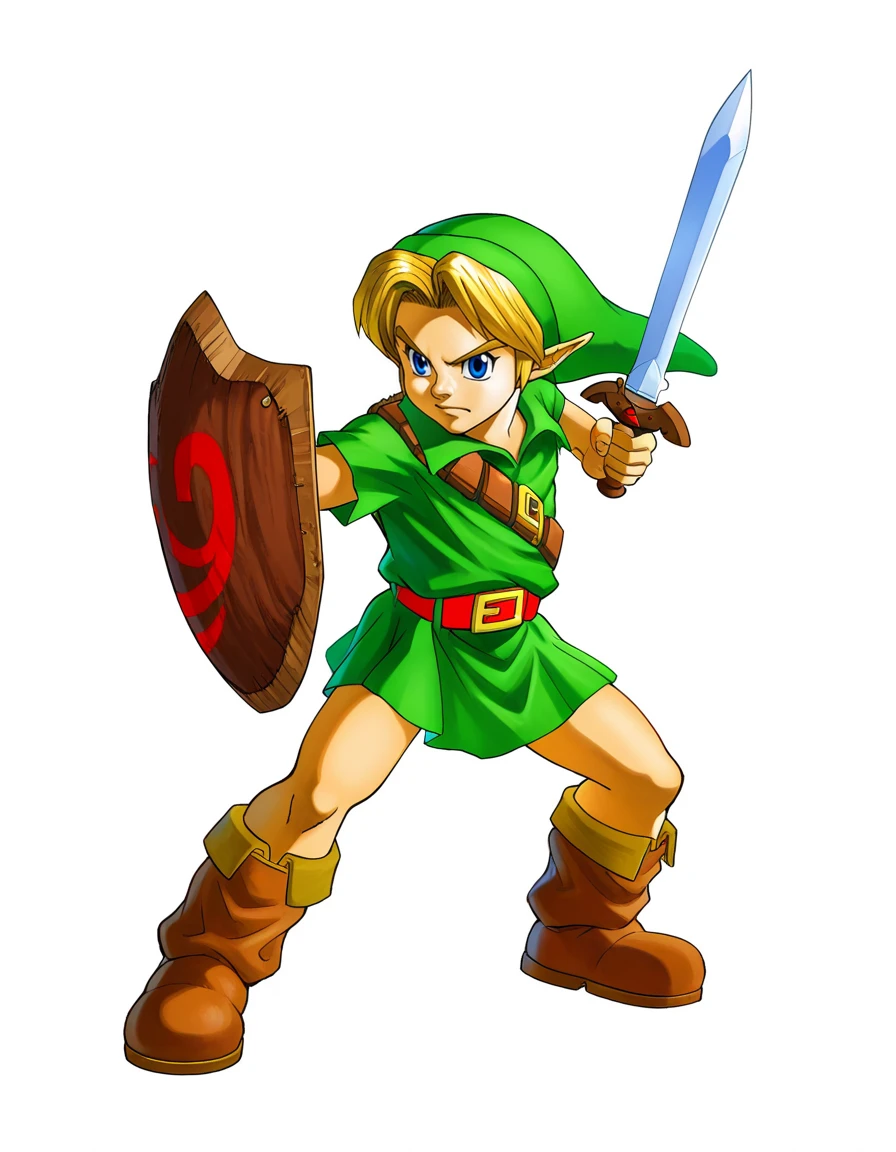 ootylink, official art, young link, 1boy, solo, male focus, the legend of zelda: ocarina of time, full body, green headwear, green tunic, green pleated skirt, collared shirt, brown knee boots, shoulder belt, blue eyes, blonde hair, holding sword, kokiri sword, holding shield, deku shield, masterpiece, best quality, absurdres, very aesthetic, <lora:ootylinkil:0.75>Description