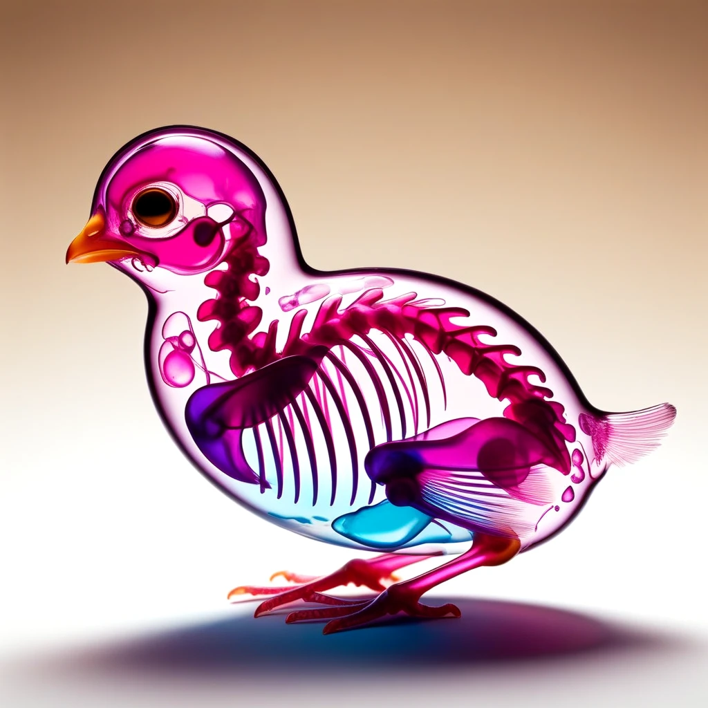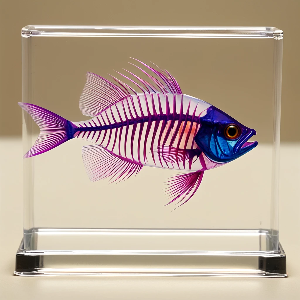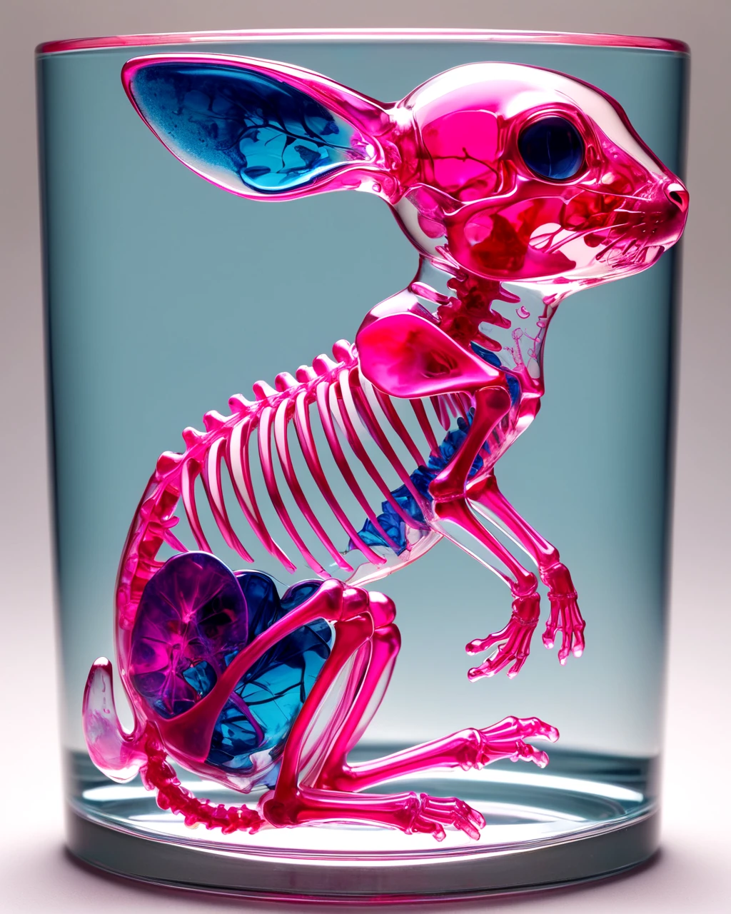 Transparent double-stained specimens, using Alcian Blue and Alizarin Red, are an impressive method for biological specimen preparation. Alcian Blue is used to stain the cartilage blue, and Alizarin Red is used to stain the bones red. This technique renders most of the specimen transparent, except for the skeletal and cartilaginous structures, which are clearly highlighted. It allows for the detailed examination of anatomical features and is particularly useful for studying complex arrangements of bones and cartilage. The result is visually impactful specimens with clearly delineated skeletal structures against transparent soft tissues, making them invaluable for educational and research purposes in fields such as ???????, zoology, and developmental biology. They have become great tools.
