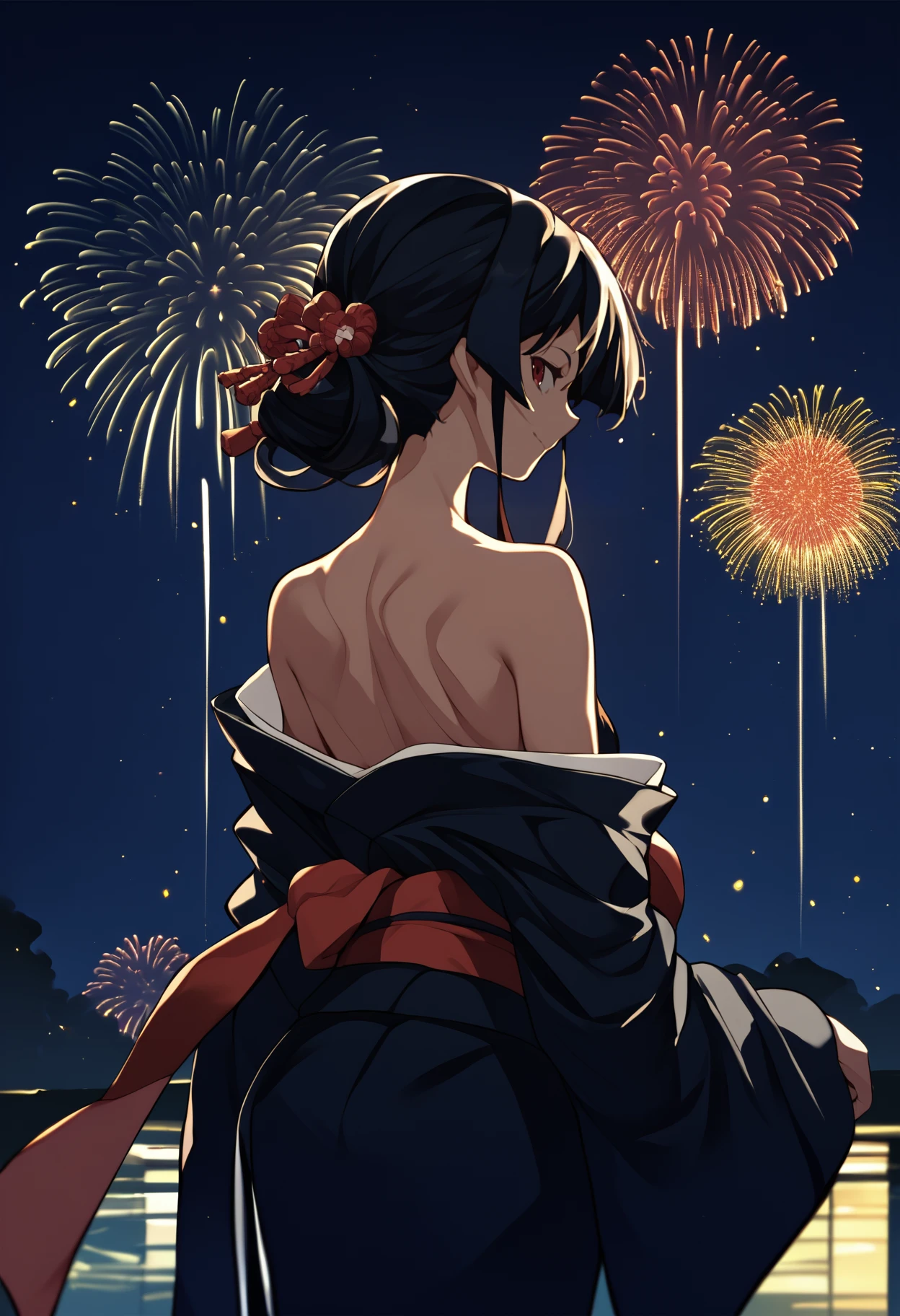 Default Outfit: black shirt, collared shirt, sleeveless shirt, red necktie, vambraces, black gloves, black skirt, belt, bare shoulders