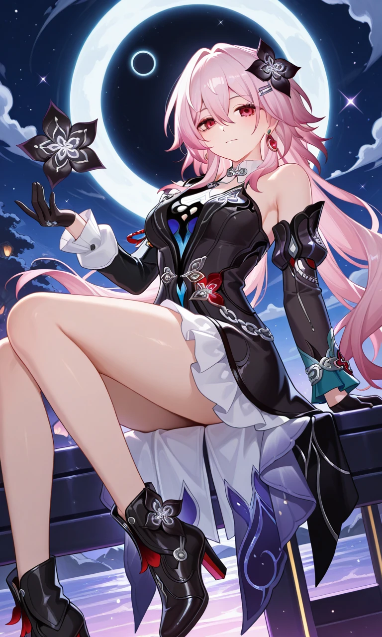 Evernight hsr, 1girl, pink hair, hair between eyes, hair ornament, hair flower, black flower, red eyes, long hair, very long hair, breasts, médium breasts, Thighs