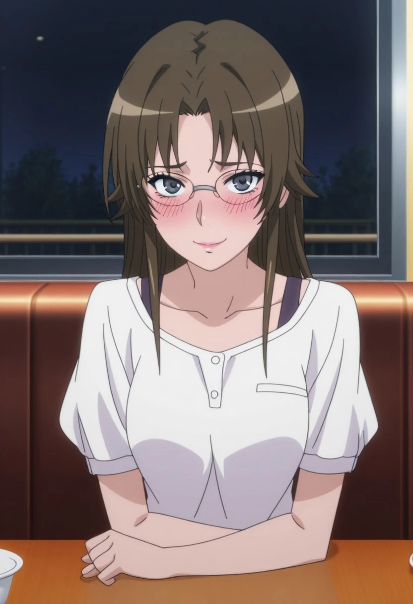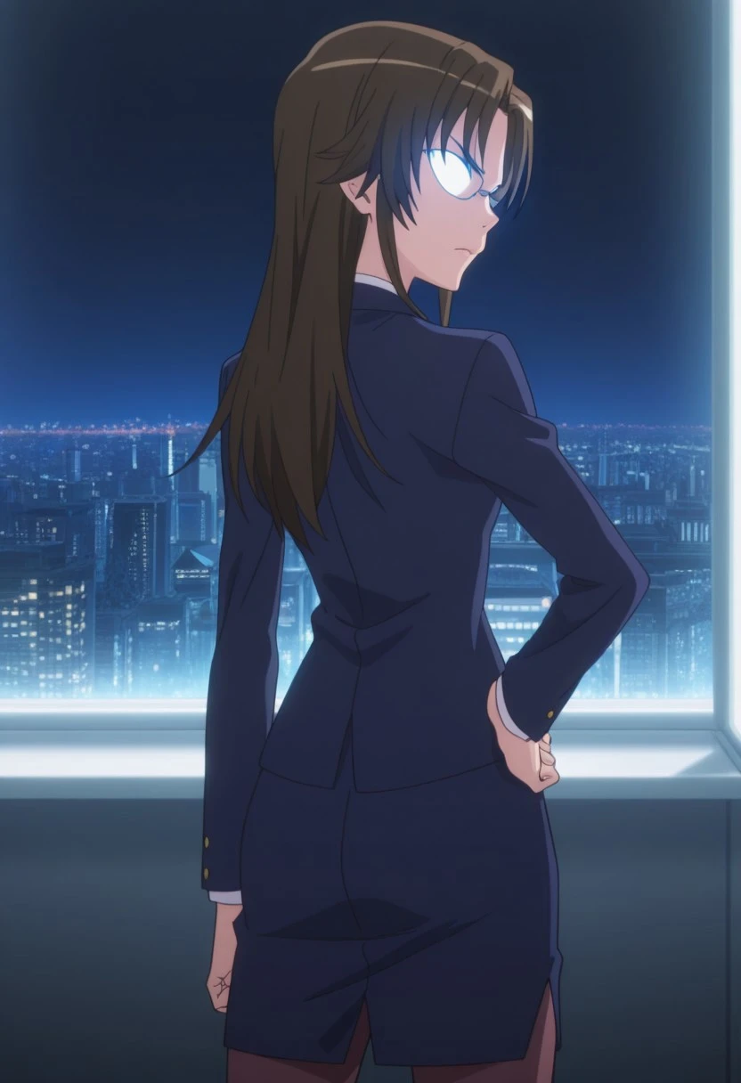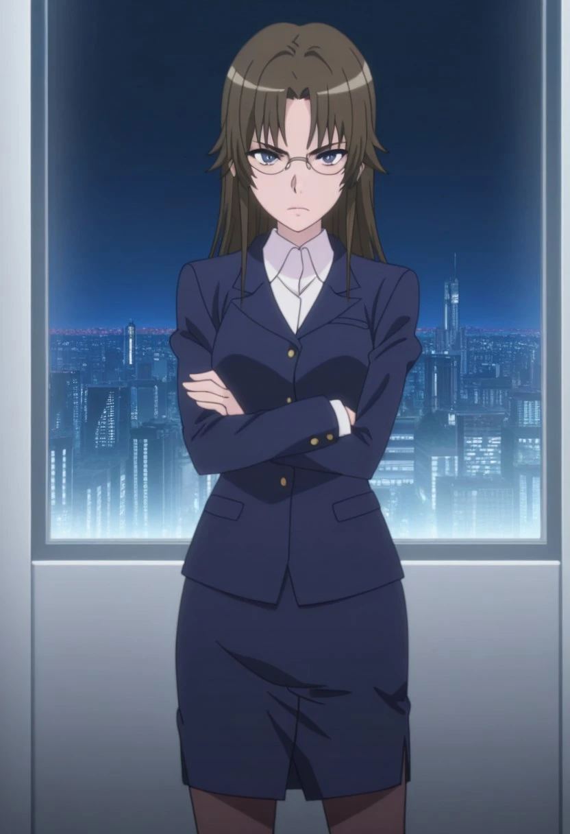 long hair, brown hair, glasses,blue blazer, pencil skirt, pantyhose