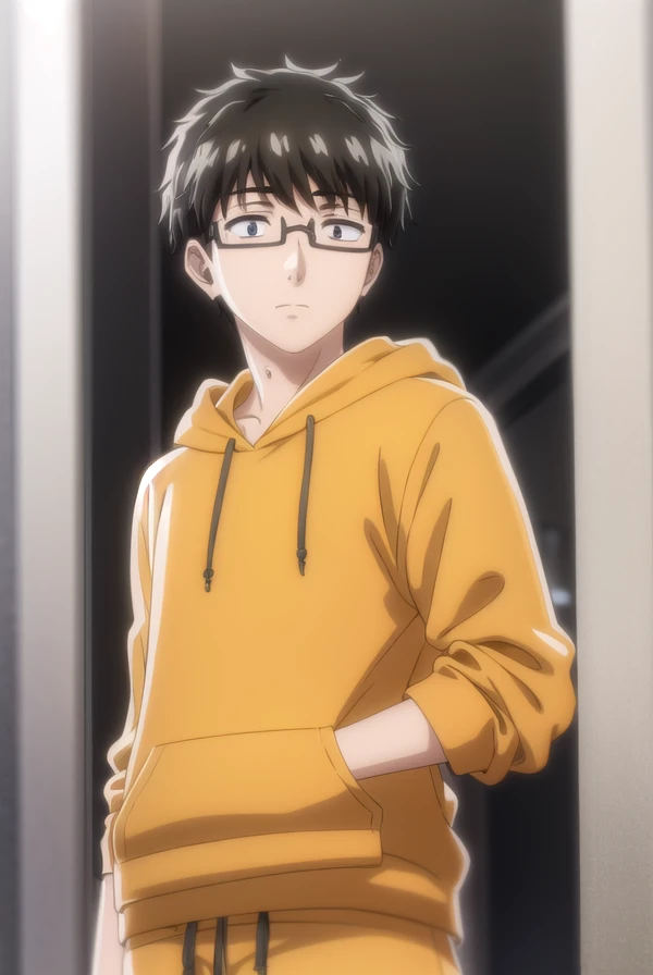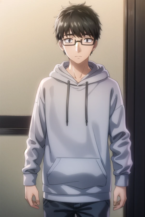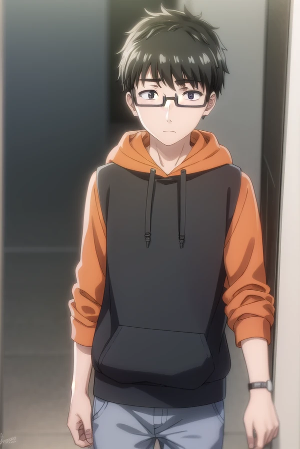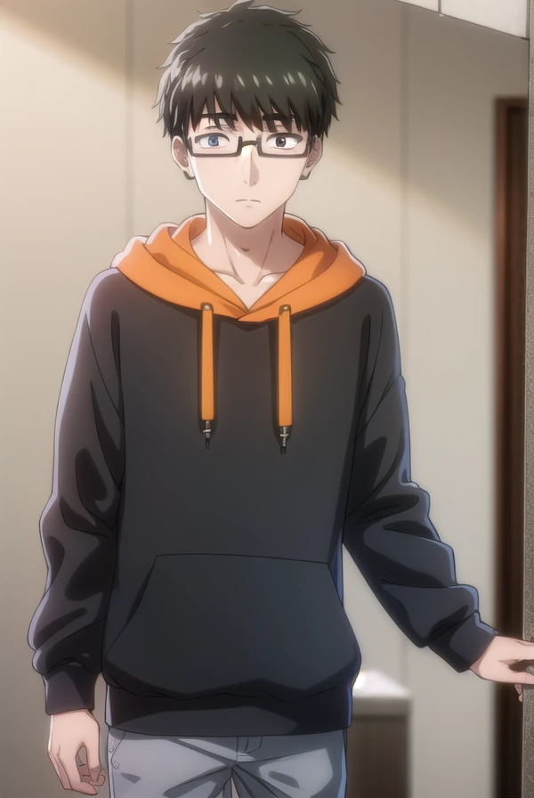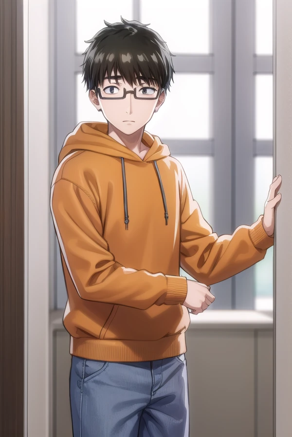 masuda, short hair, black hair, male focus, glasses, black-framed eyewear, (black eyes:1.5),