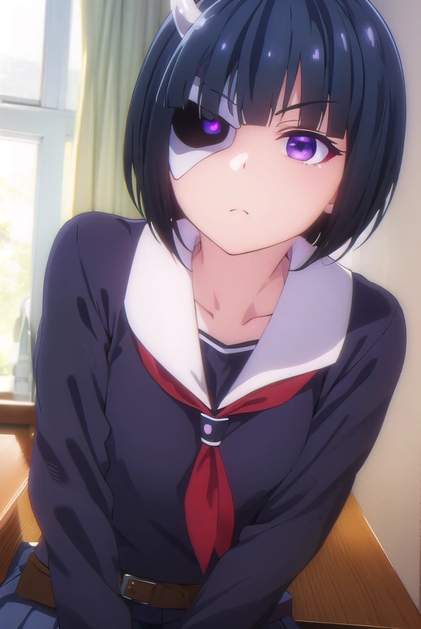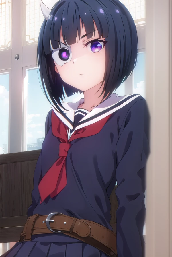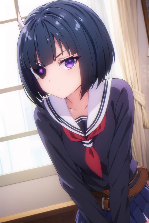 rin onigawara, short hair, bangs, black hair, (purple eyes:1.1), bob cut,
