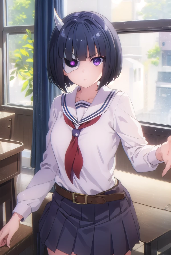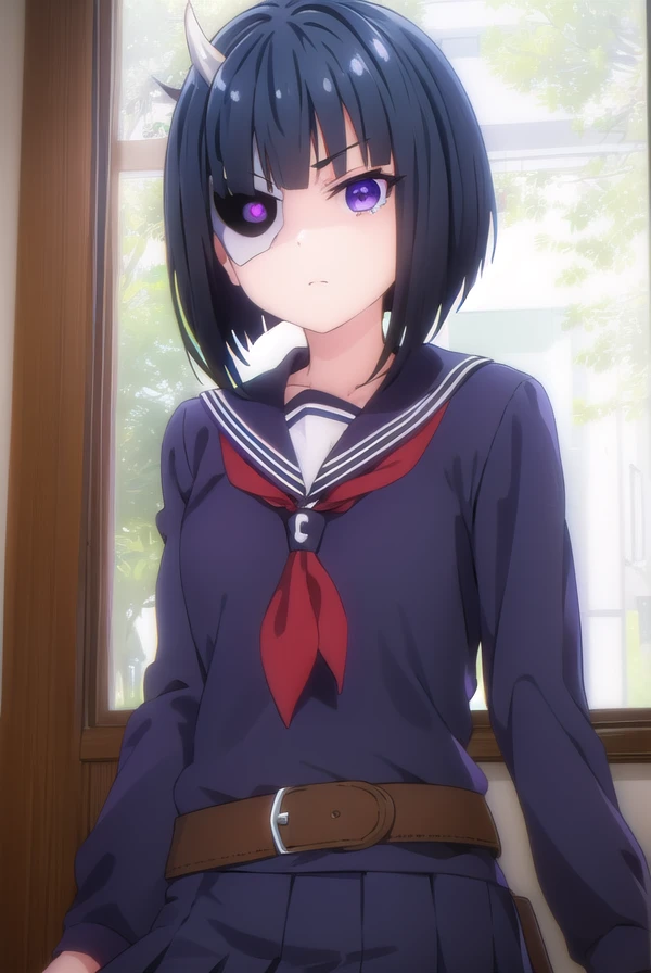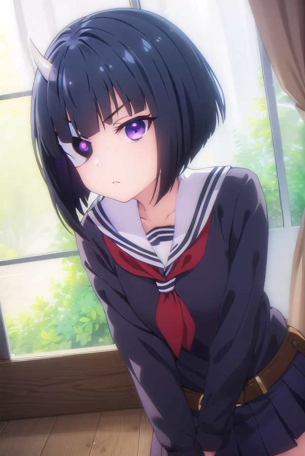 rin onigawara, short hair, bangs, black hair, (purple eyes:1.1), horns, mask, bob cut, single horn,