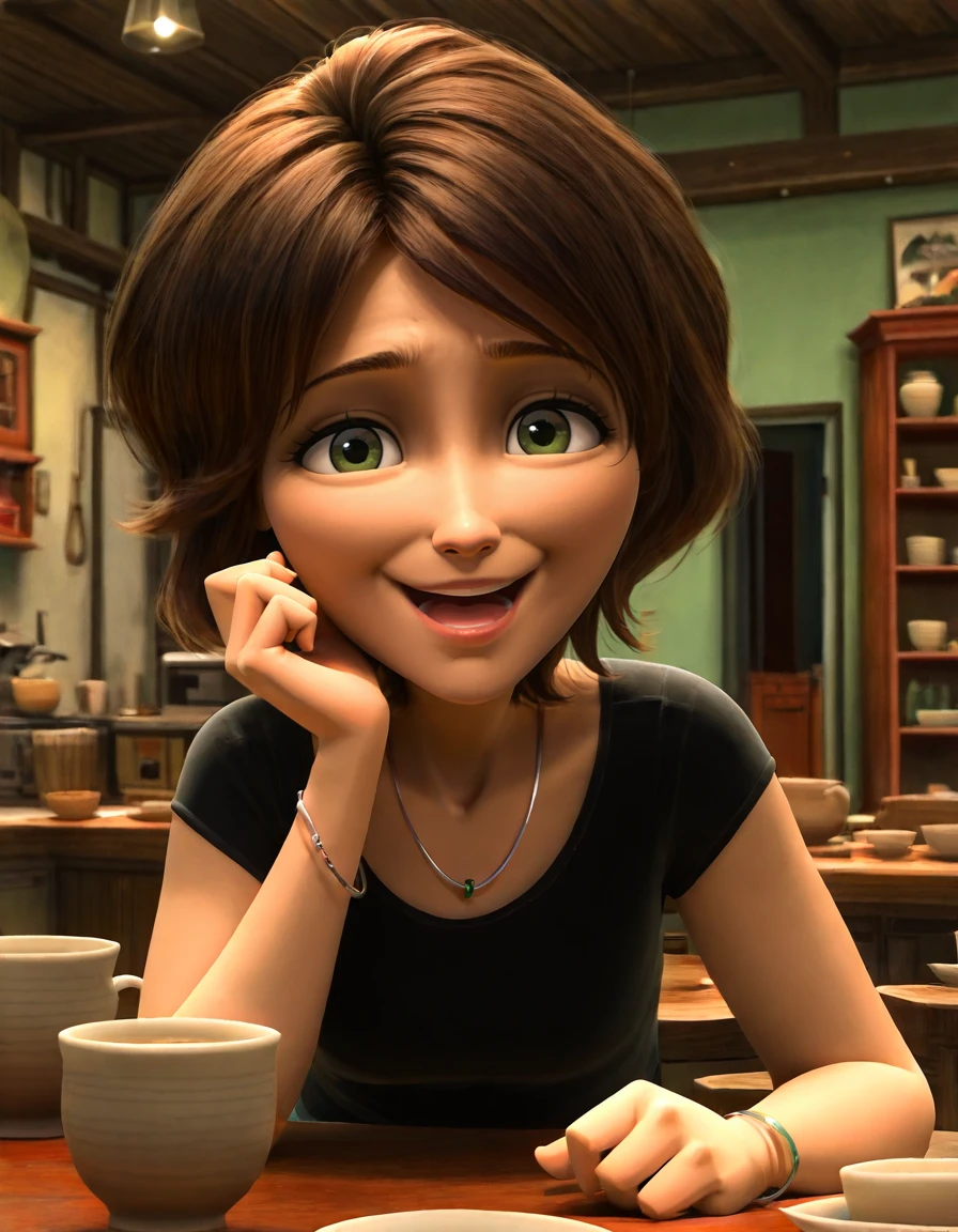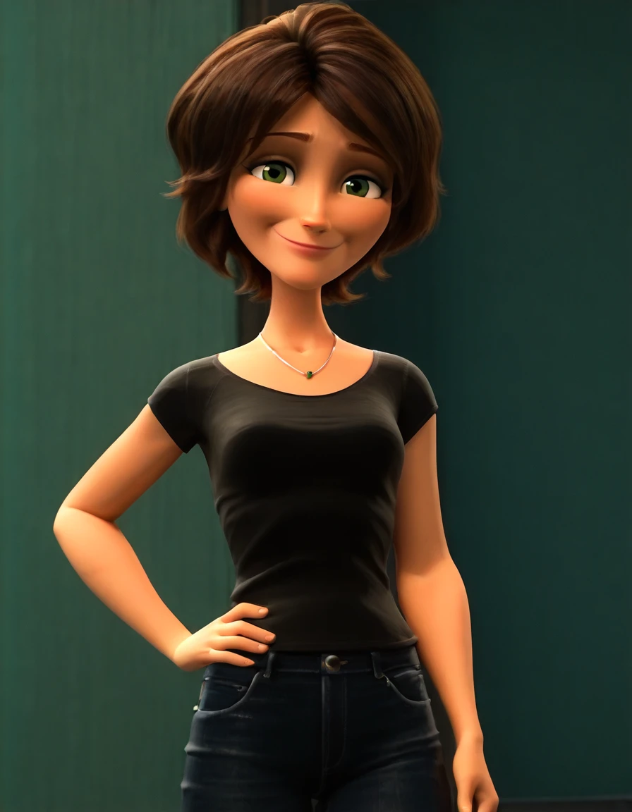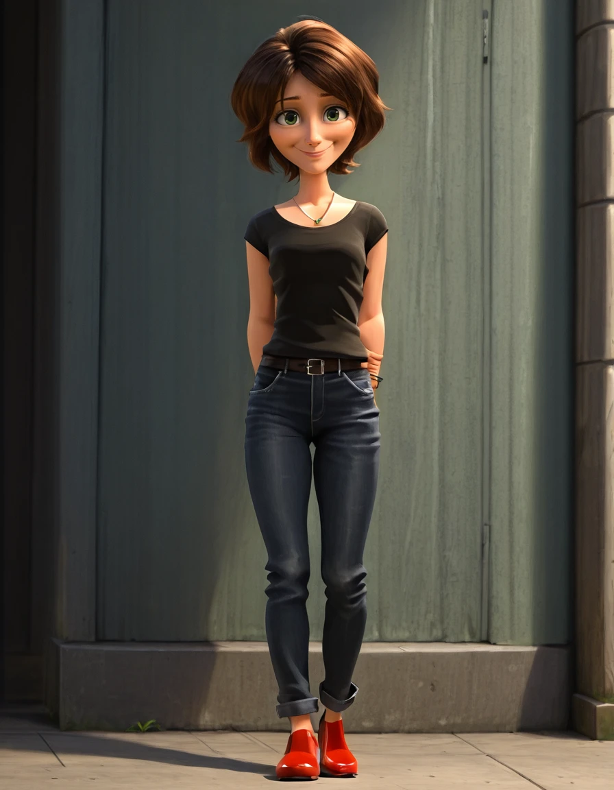 auntcass, 1girl, brown hair, short hair, solo, black shirt, necklace, green eyes, jeans, bracelet