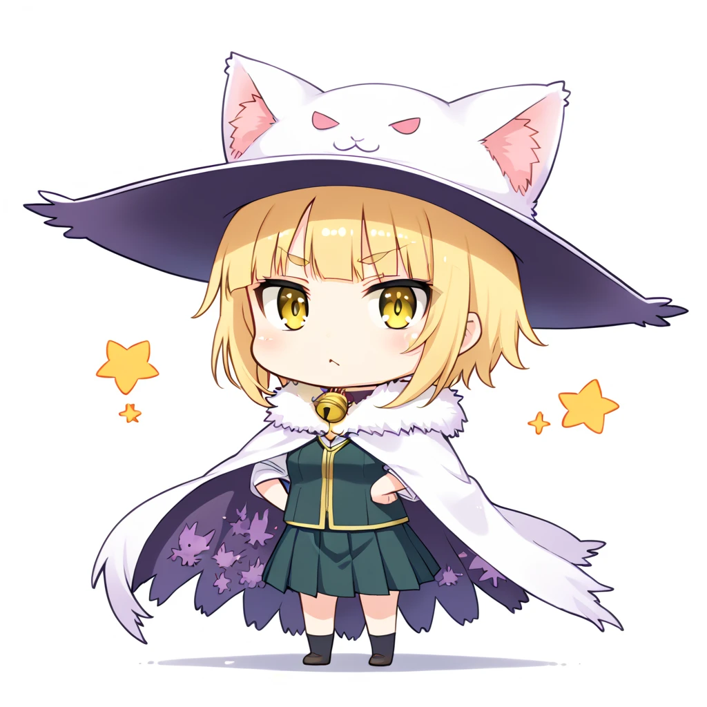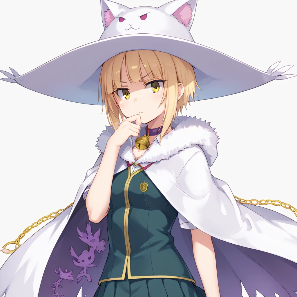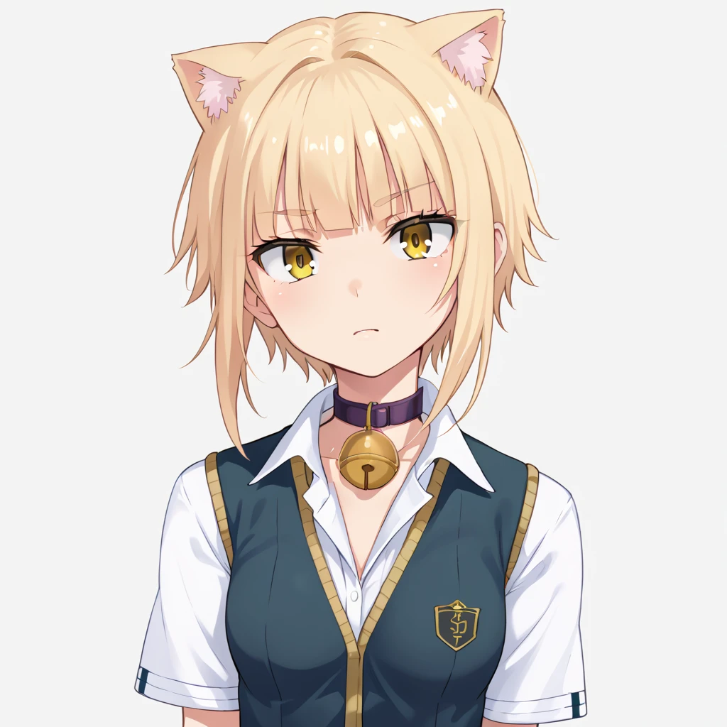 brown eyes, cat ears, blonde hair, yellow eyes, neck bell, school uniform