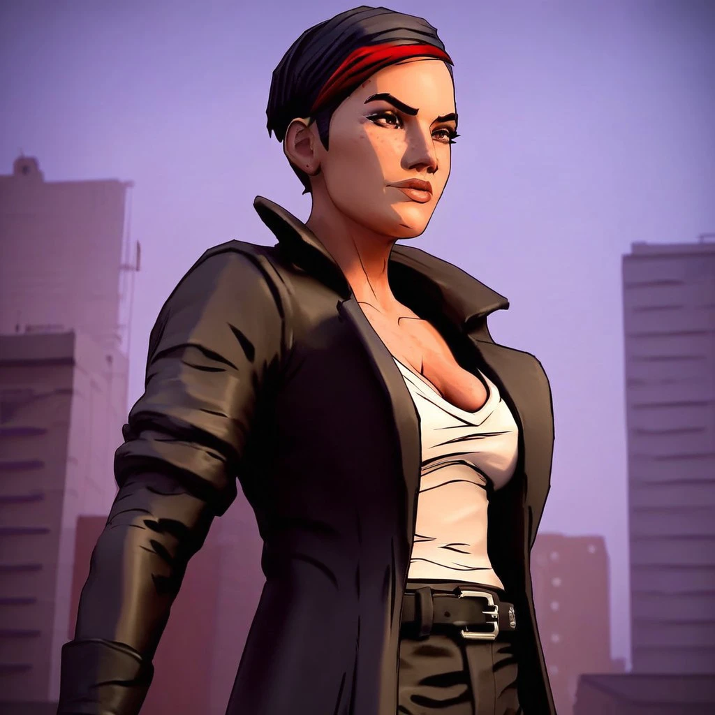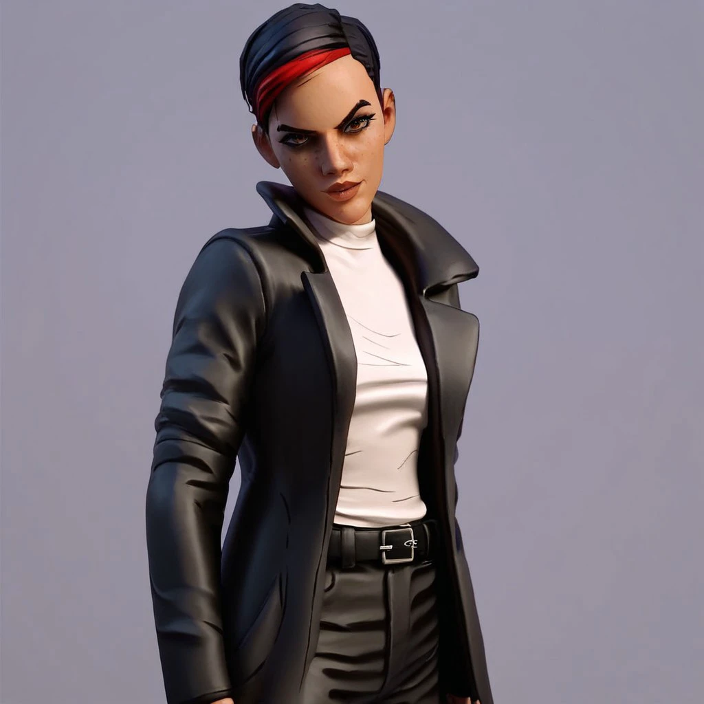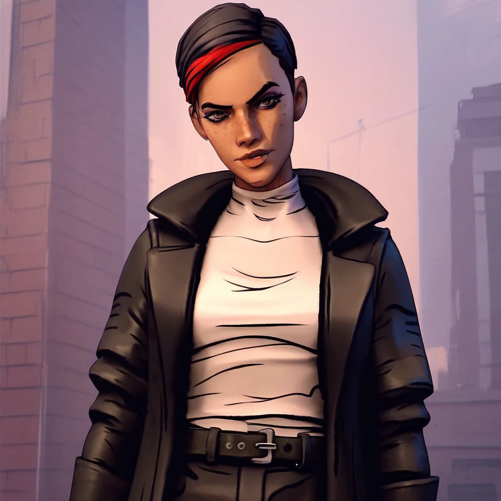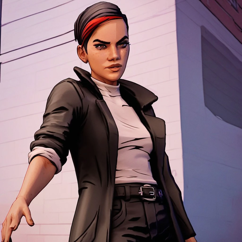 1girl, solo, multicolored hair, belt, long coat, white shirt, brown eyes, freckles, white shirt, black jacket, undercut, boots, cleavage,