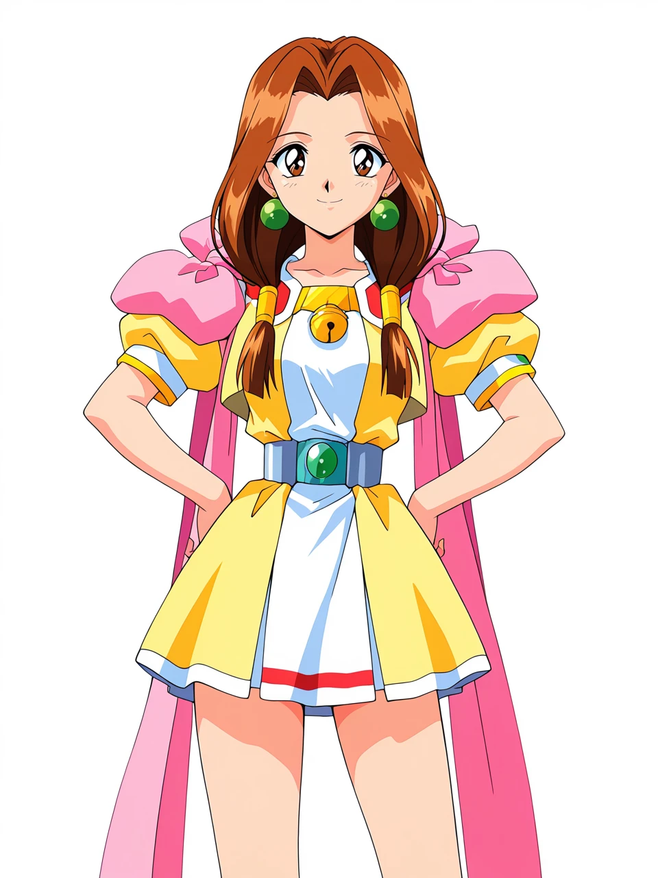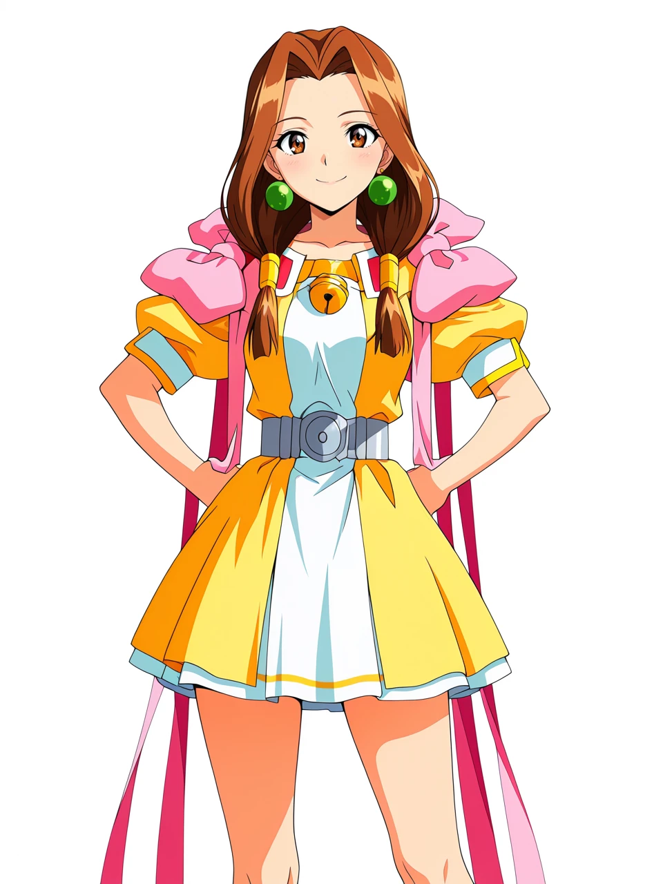 yellow dress, white dress, skirt, silver belt, pink bow, puffy sleeves, puffy short sleeves, bell, long ribbon,