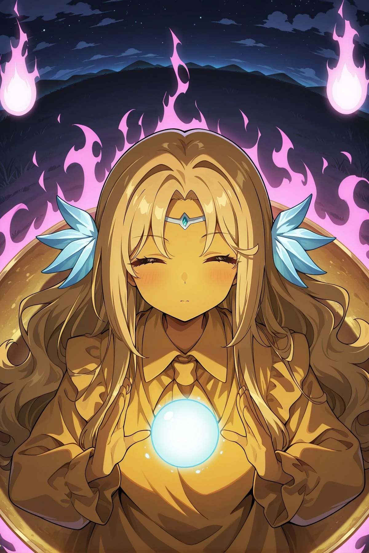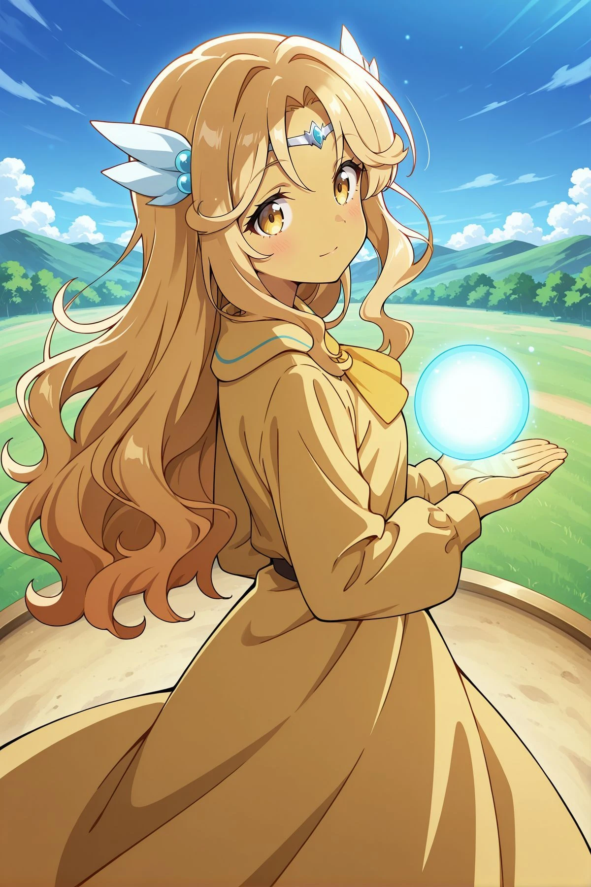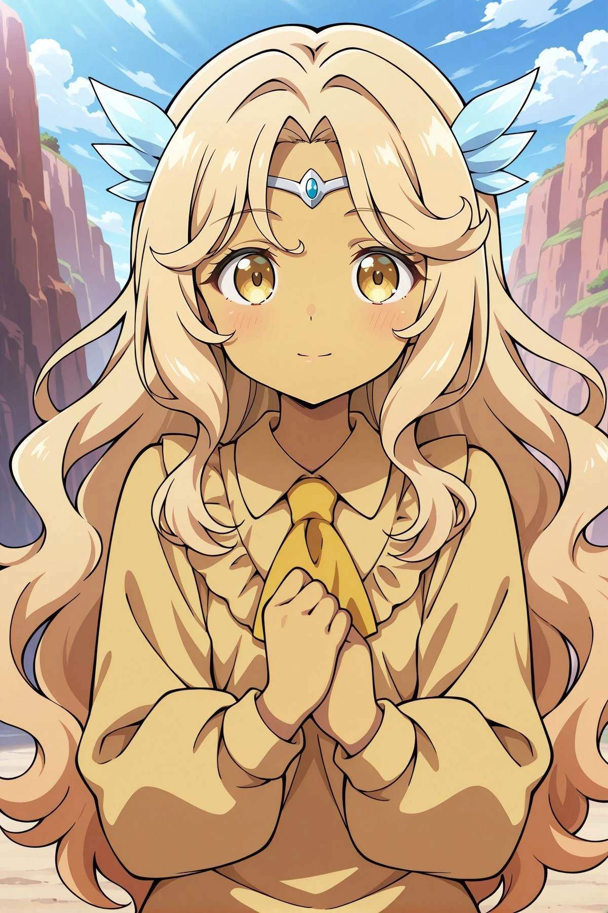 kikuri, 1girl, solo, yellow eyes, blonde hair, long hair, wavy hair, hair intakes, yellow skin,circlet, hair ornament, yellow shirt, yellow ascot, collared shirt, puffy long sleeves,Optional :