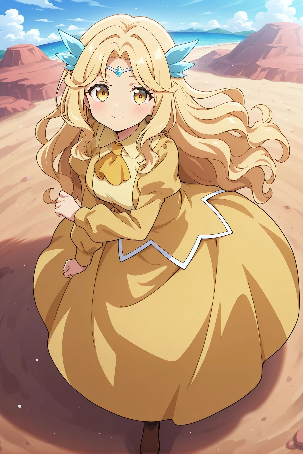 kikuri, 1girl, solo, yellow eyes, blonde hair, long hair, wavy hair, hair intakes, circlet, hair ornament, yellow shirt, yellow ascot, collared shirt, puffy long sleeves, yellow skirt, None from Touhou LostWord