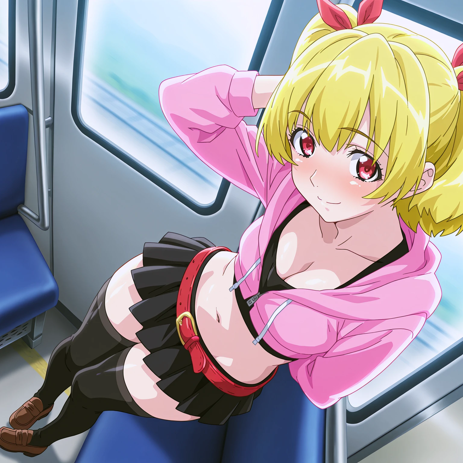 Descriptors (these can be changed based on your preferences): blonde hair, twintails, hair bow, red eyes, small breasts,