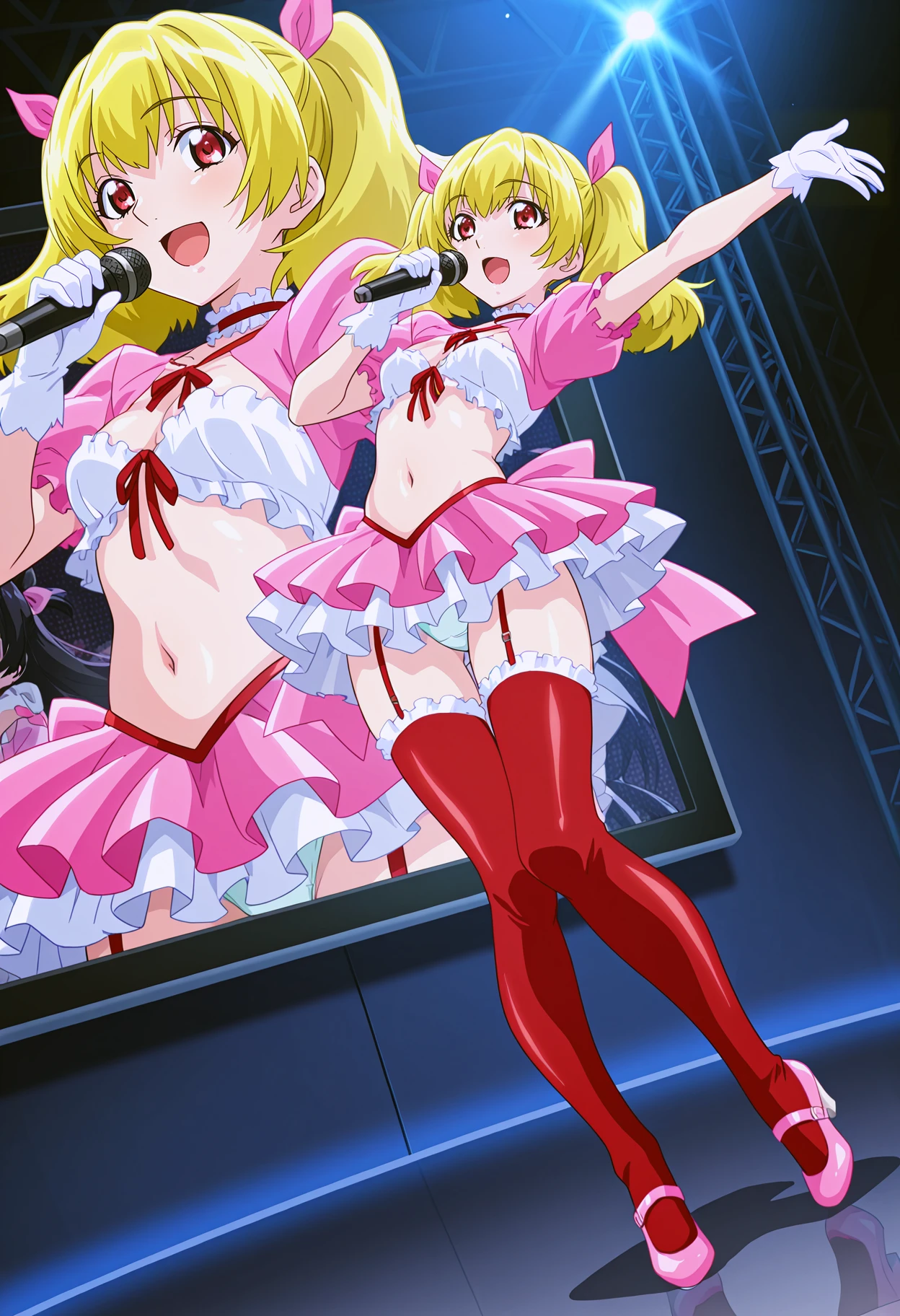 idol outfit, puffy sleeves, white gloves, frills, midriff, navel, miniskirt, zettai ryouiki, pink skirt, frilled skirt, garter straps, garter belt, red thighhighs, pink pumps