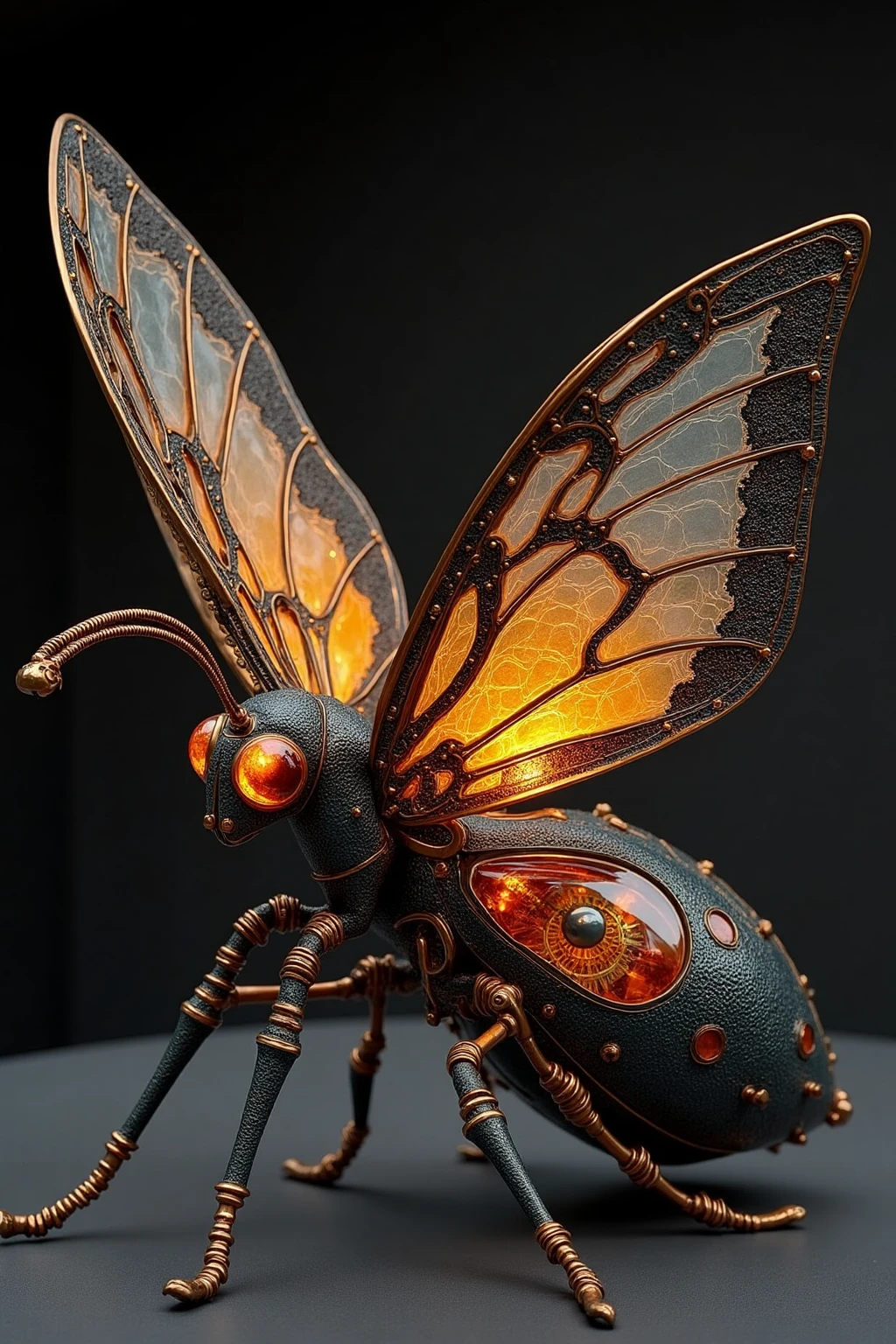 Steampunk - styled insect sculptures, moth with steam - powered wings, lead body, onyx markings, dimly lit airship interior.