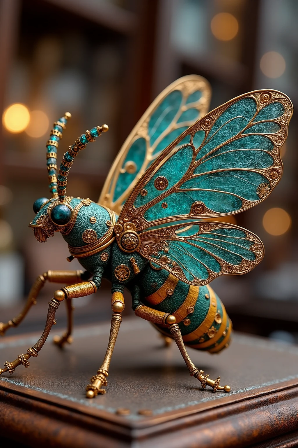 Steampunk - styled insect sculptures, cicada with gear - like wings, gold plating, topaz decorations, antique laboratory scene.