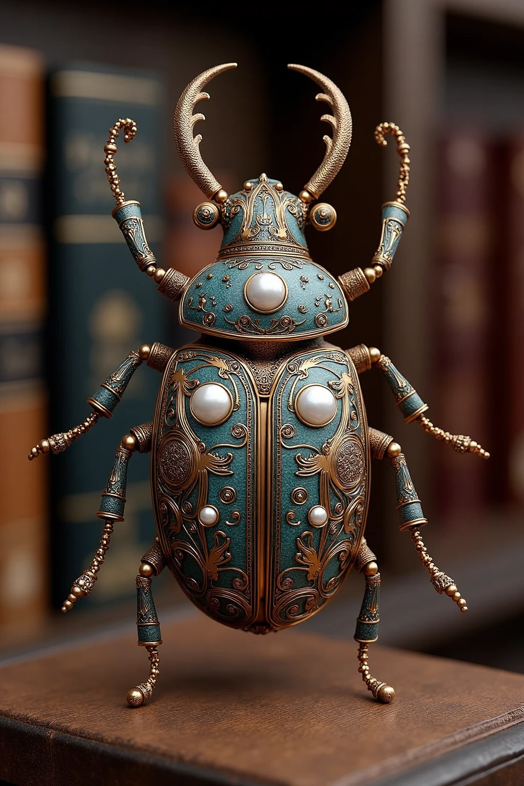 Steampunk - styled insect sculptures, beetle with filigree patterns, iron body, pearl inserts, old - world library backdrop.
