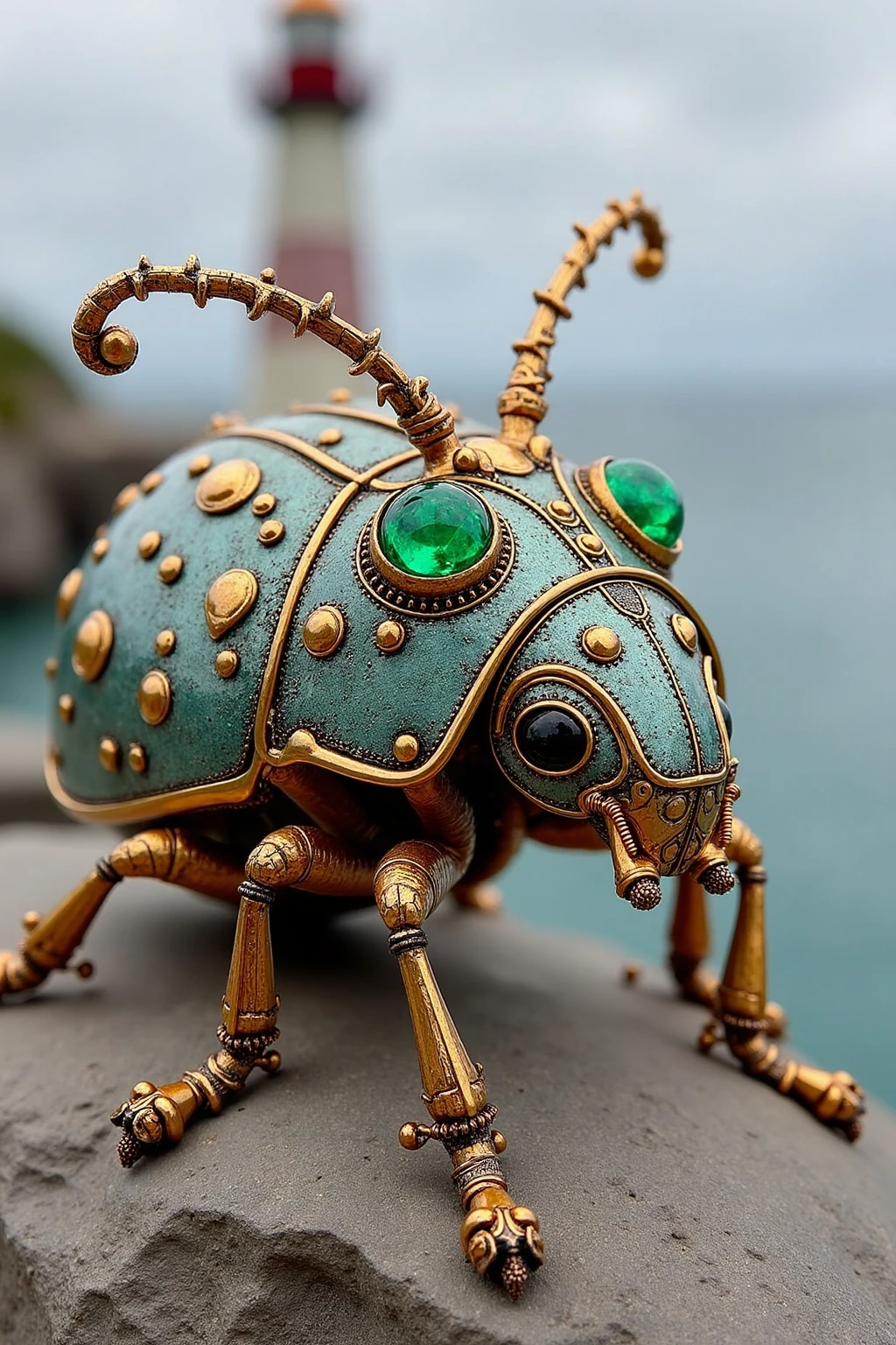 Steampunk - styled insect sculptures, ladybug with riveted shell, zinc body, peridot spots, coastal lighthouse environment.