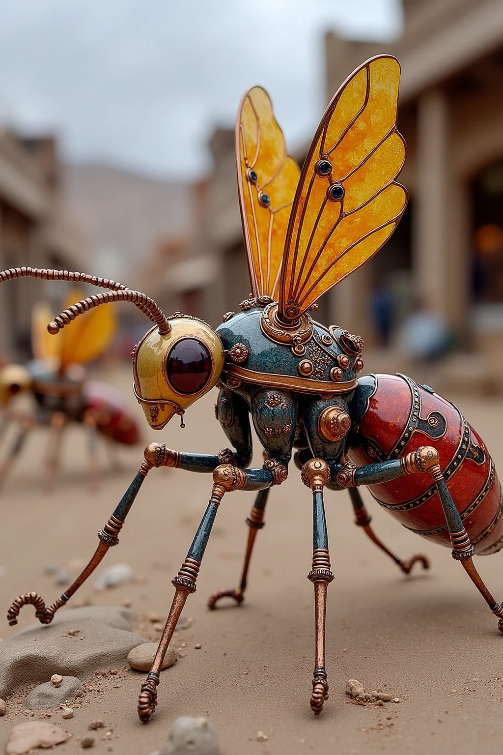 Steampunk - styled insect sculptures, wasp with spring - loaded stinger, tin body, garnet highlights, desert mining town setting.
