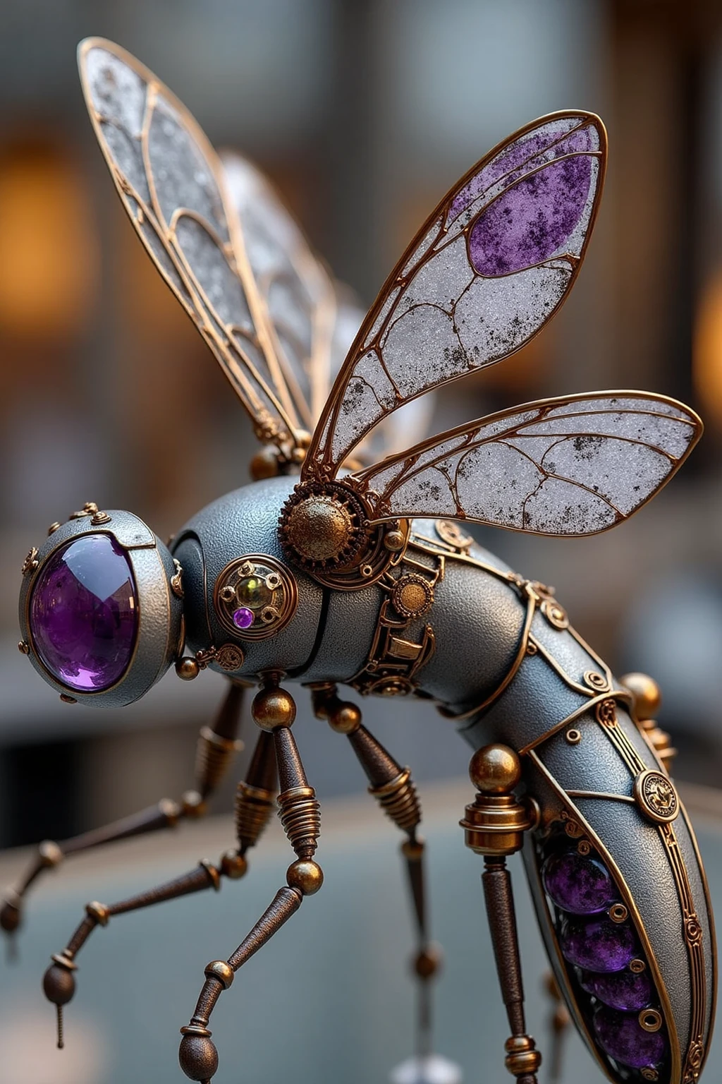 Steampunk - styled insect sculptures, dragonfly with turbine wings, silver body, amethyst studs, futuristic factory ambiance.