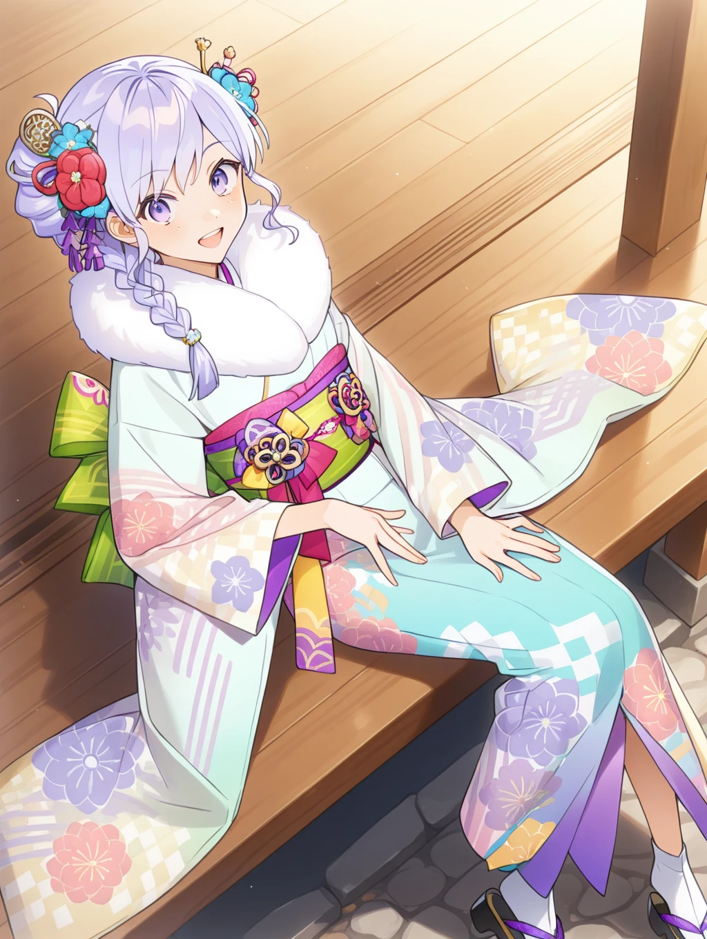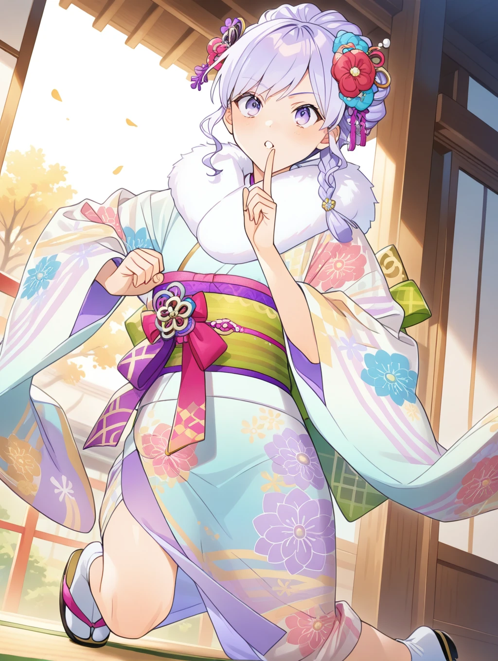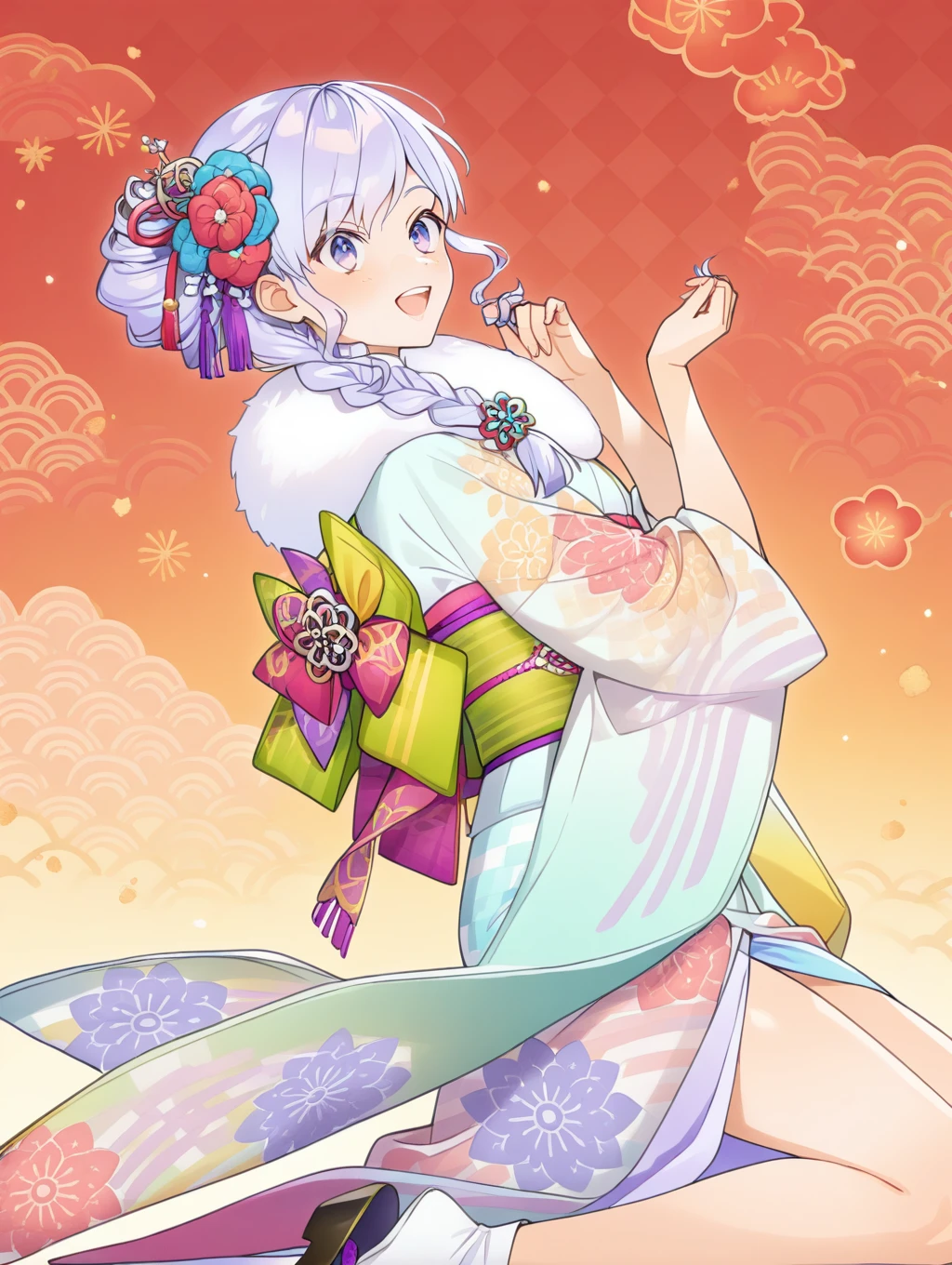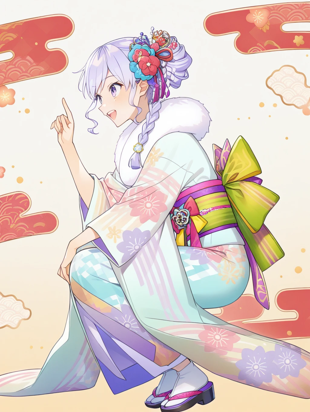 prompt example :hatuharu,braid,updo,purple eyes,hair ornament,fur trim,japanese clothes,wide sleeves,sash,tabi,waraji,