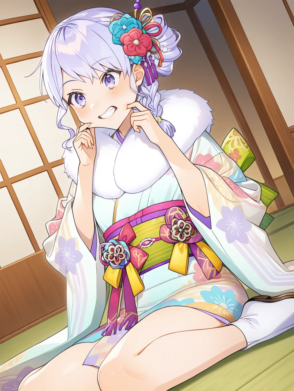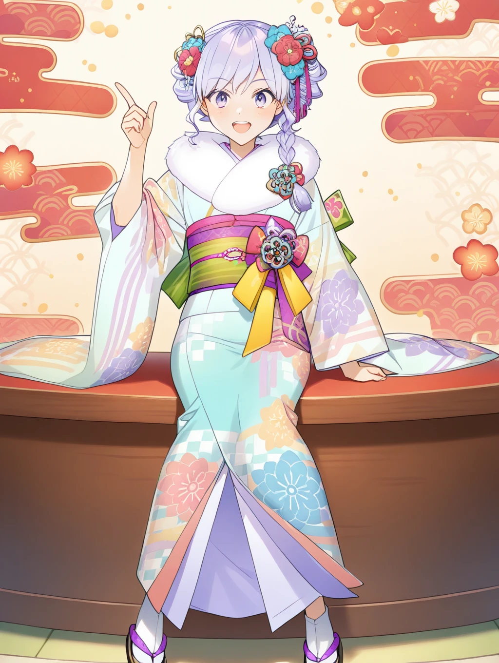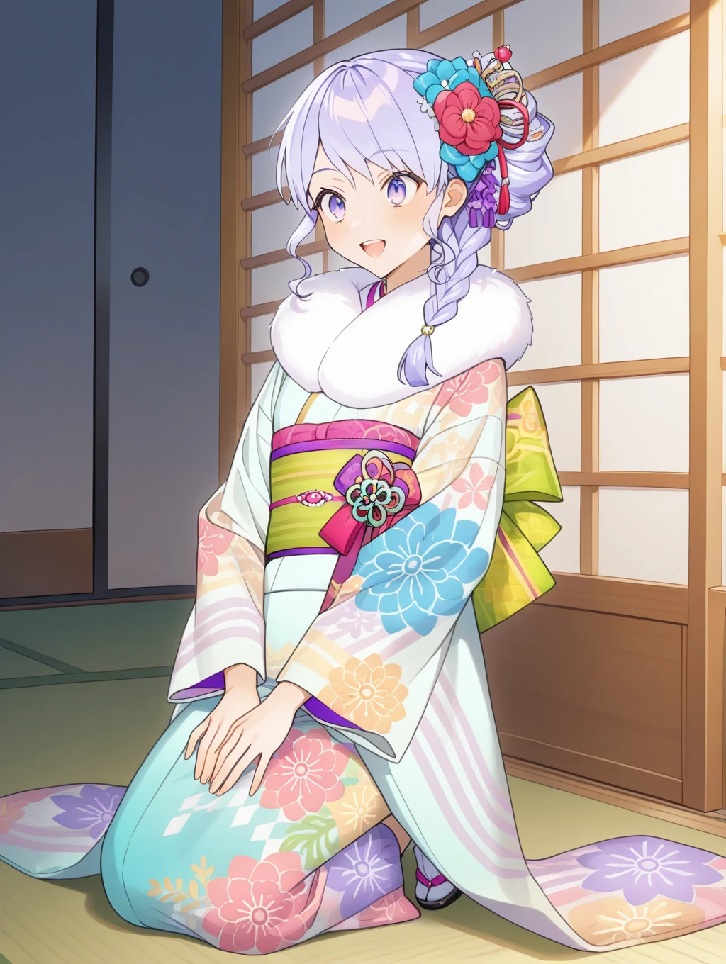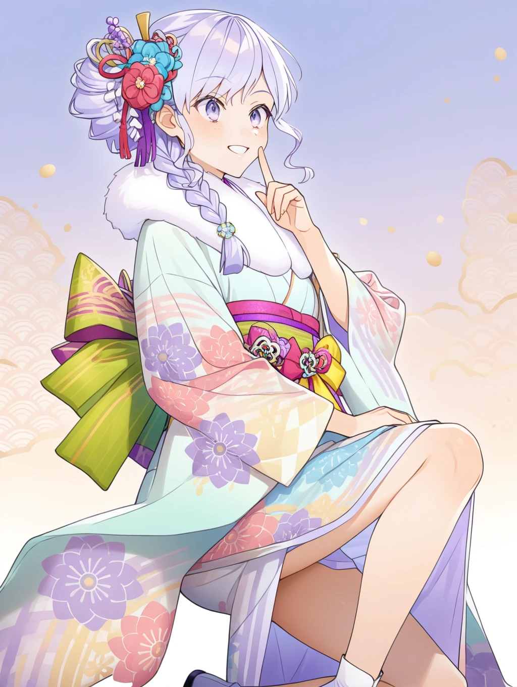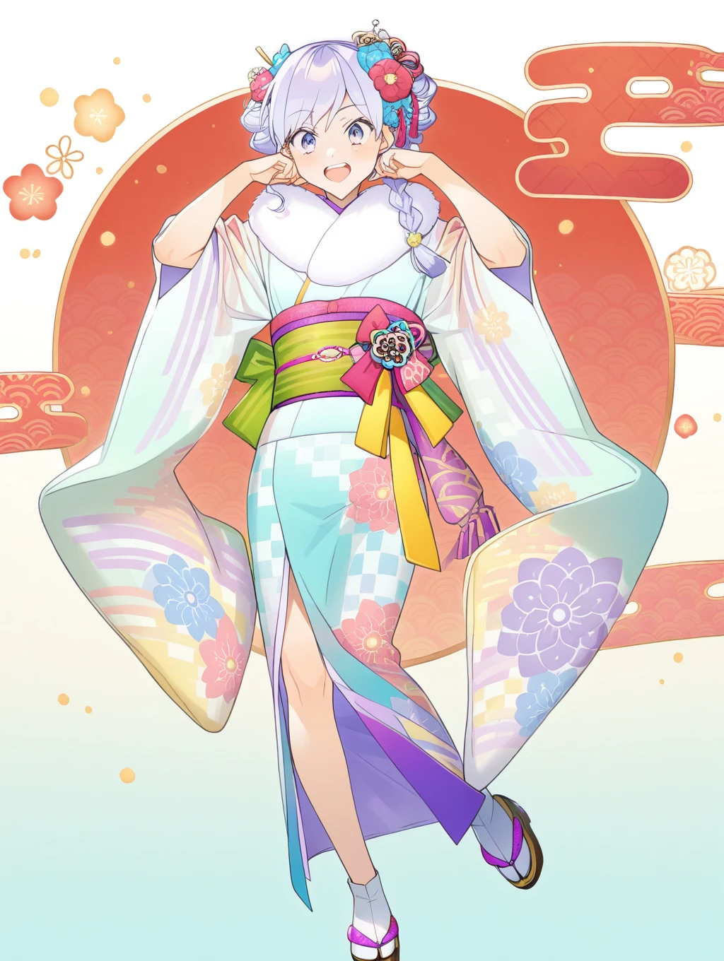 prompt example :hatuharu,braid,updo,purple eyes,hair ornament,fur trim,japanese clothes,wide sleeves,sash,tabi,waraji,