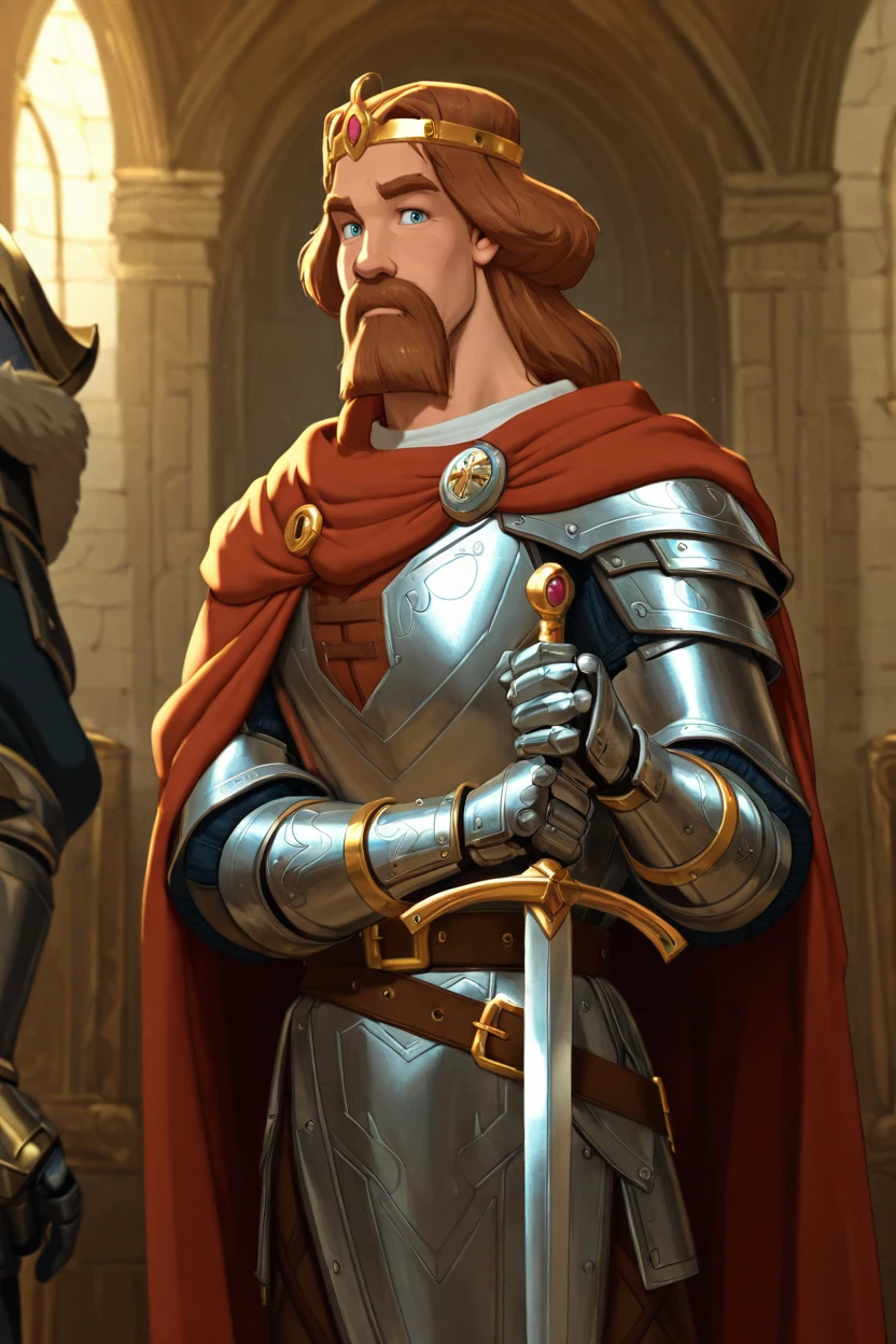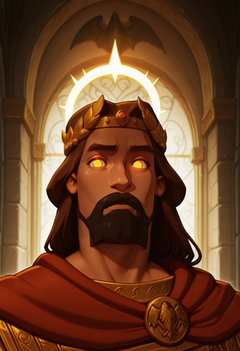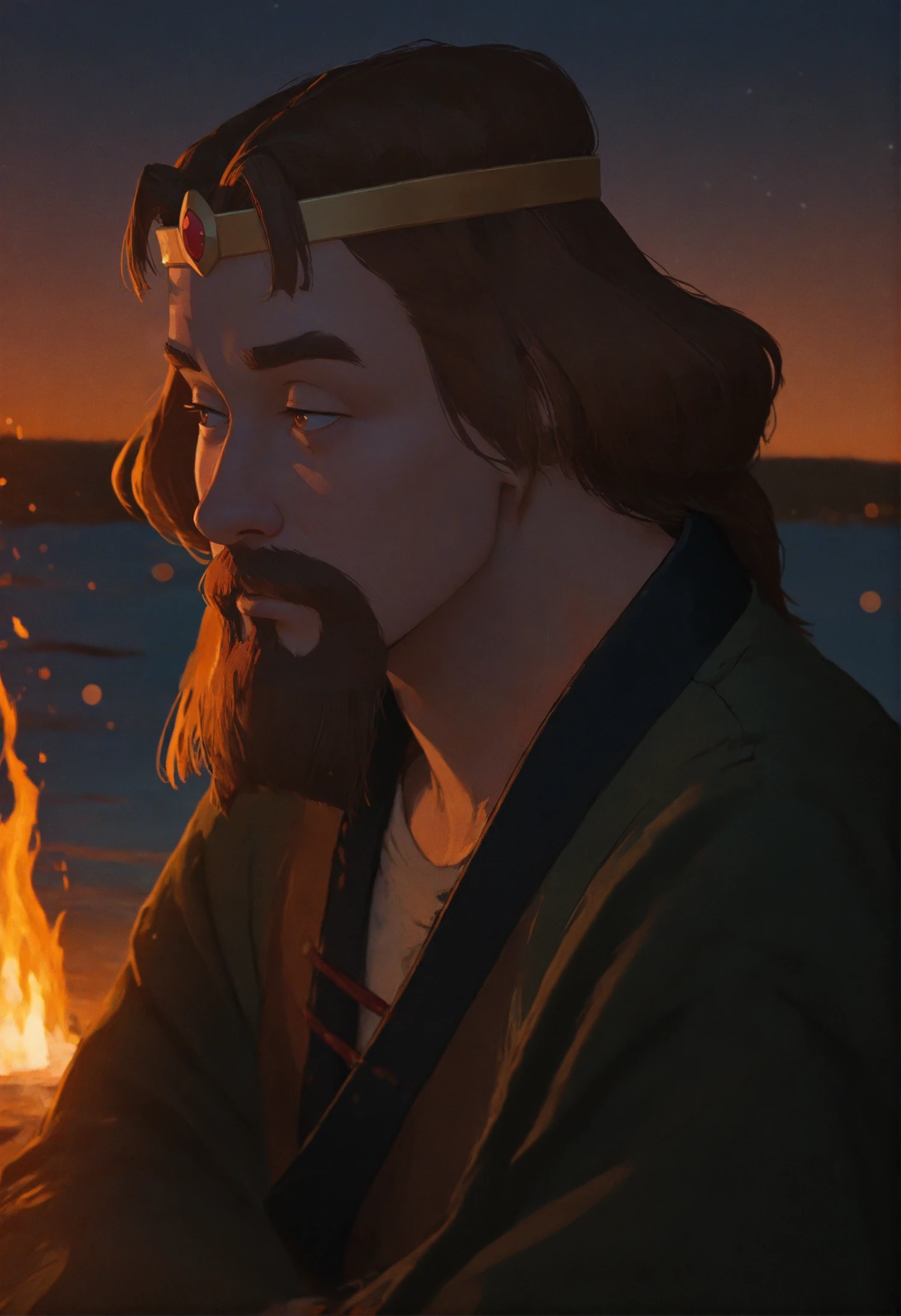 Trigger word - knyaza, 1boy, male focus, brown hair, solo, facial hair, red cape, blush stickers, thick eyebrows, blue eyes, mustache, circlet, beard, blush,