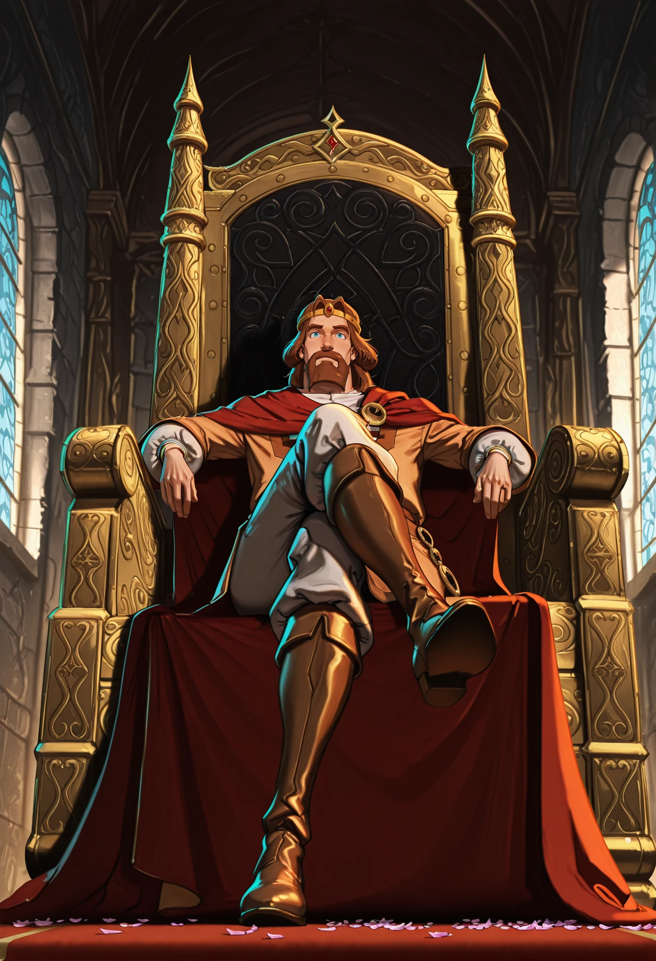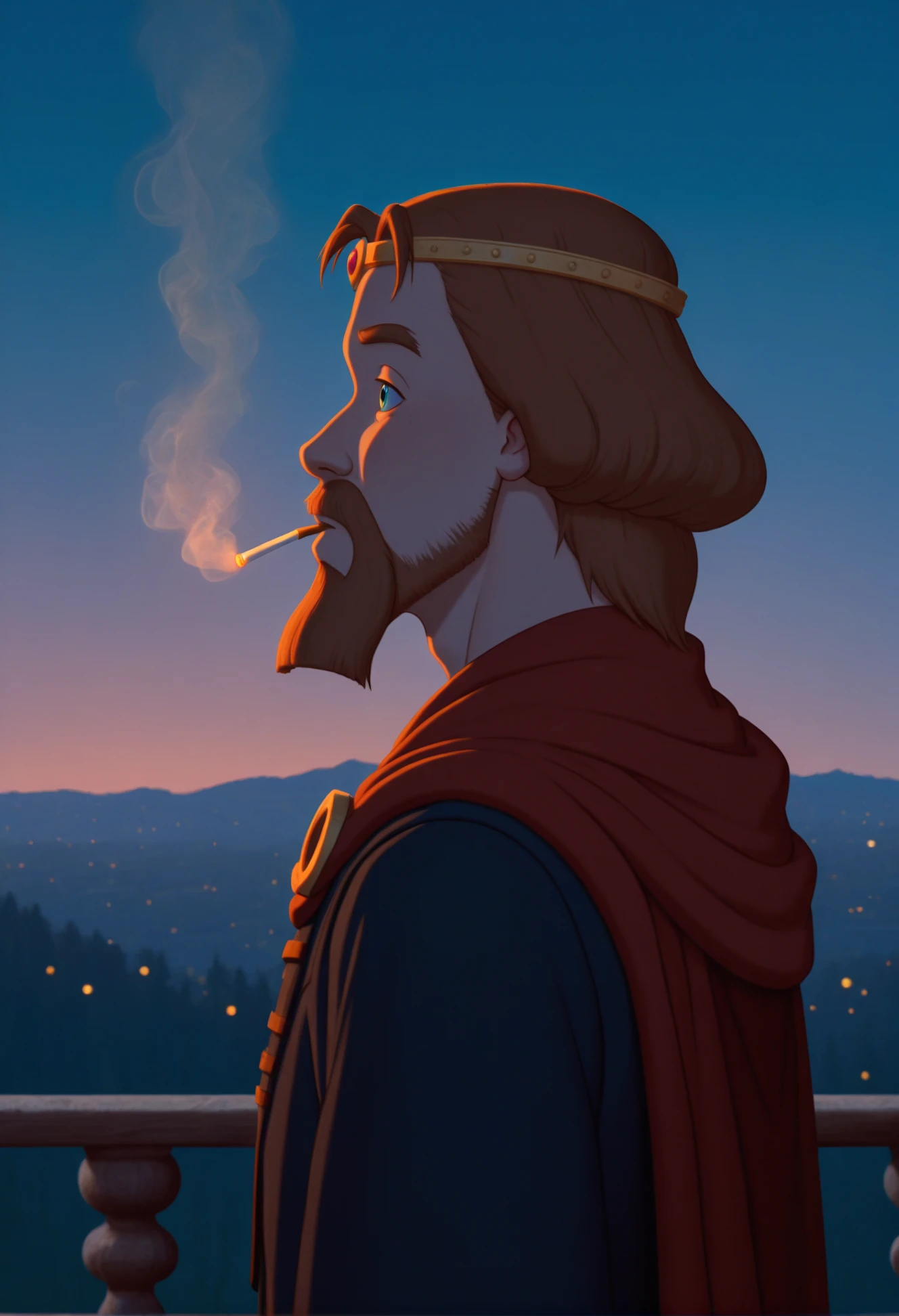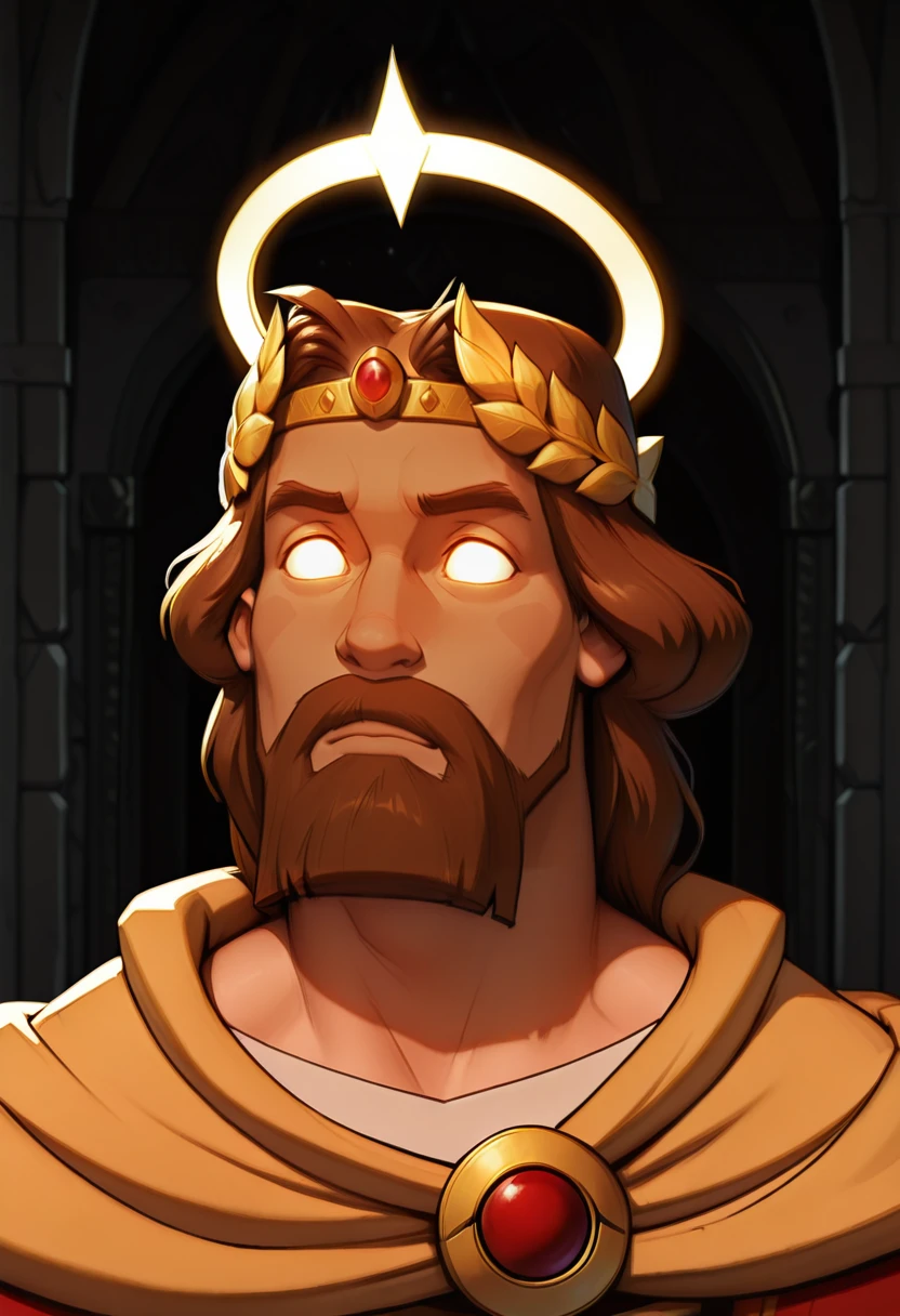 Trigger word - knyaza, 1boy, male focus, brown hair, solo, facial hair, red cape, blush stickers, thick eyebrows, blue eyes, mustache, circlet, beard, blush,