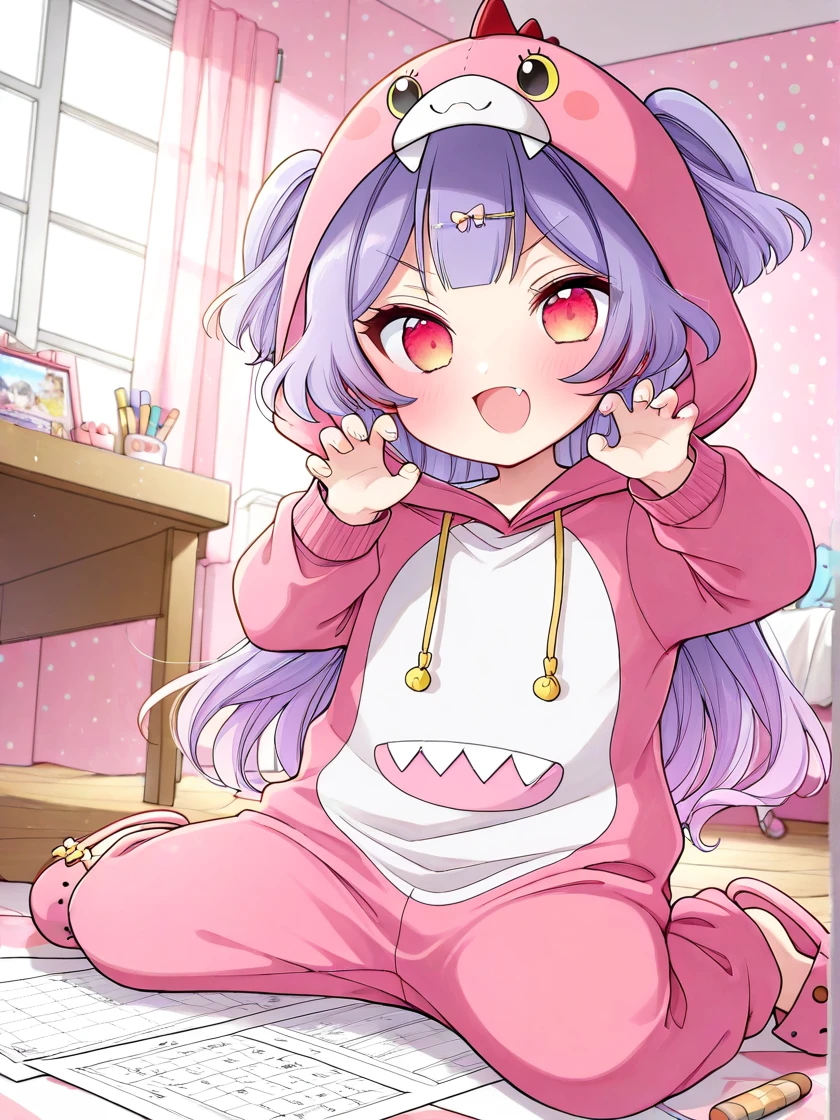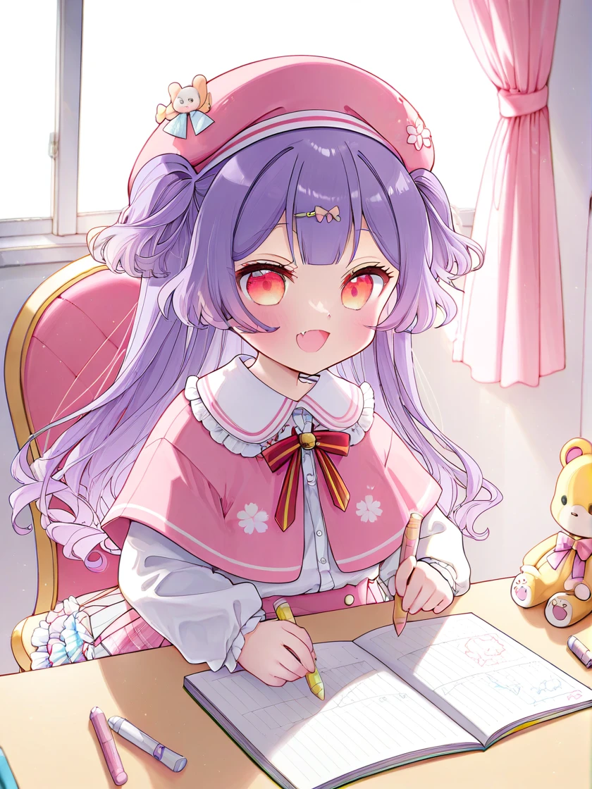 <lora:suzuhara_coco_illustrious:1>, suzuhara coco, child, female child, long hair, very long hair, bangs, multicolored clothes, purple hair, light purple hair, two side up, multicolored hair, gradient hair, two-tone hair, hair ornament, hairclip, hair bow, pink hair bow, pink hairclip, red eyes, pink eyes, yellow eyes, gradient eyes, multicolored eyes, fang