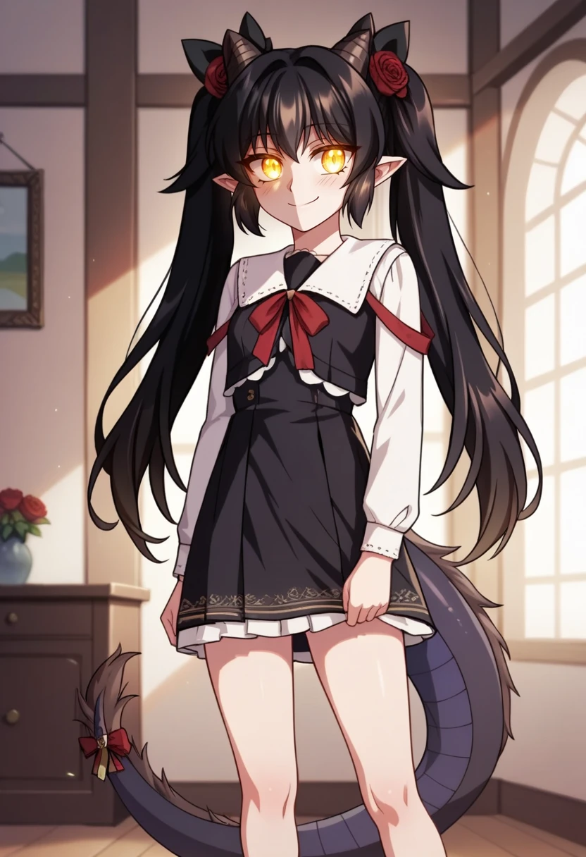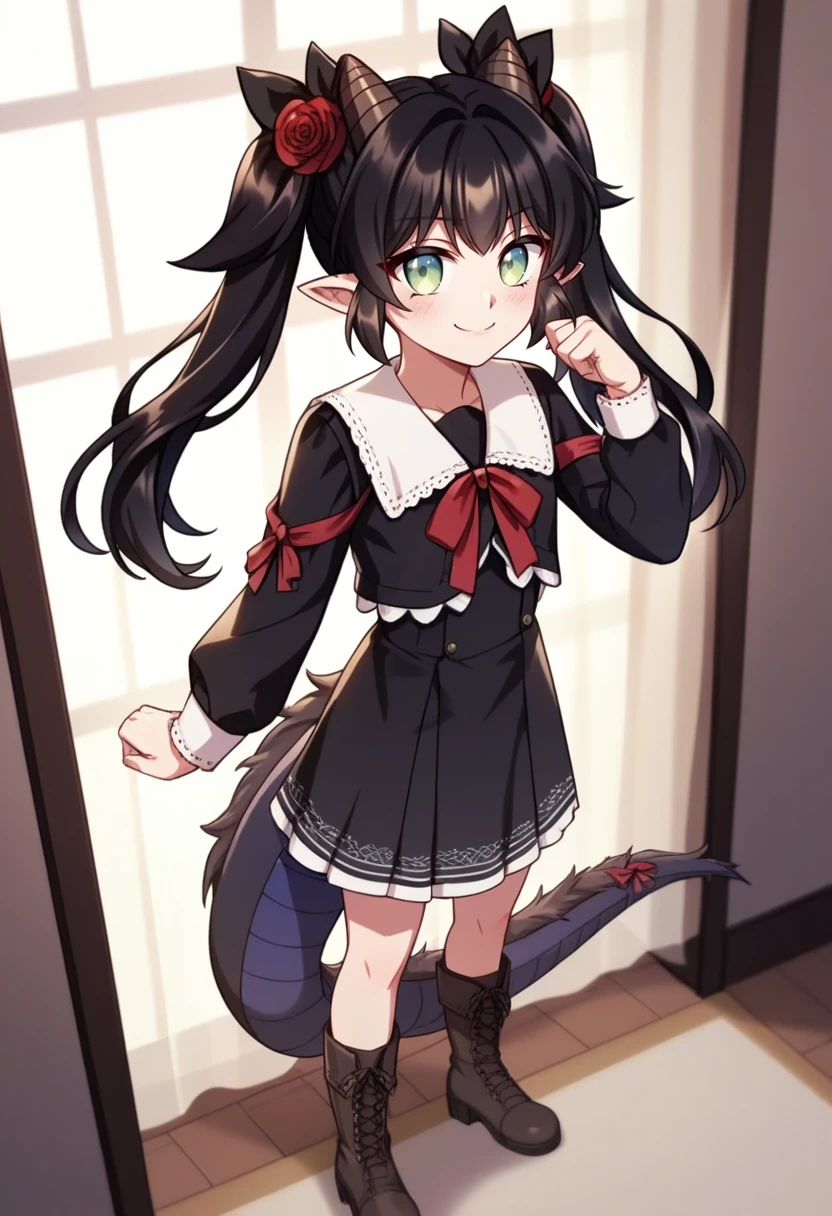 regressor_manual, Dialuria, green eyes, black hair, twintails, hair ornament, hair flower, pointy ears, horns, dragon tail, black dress,