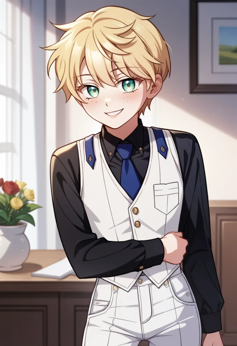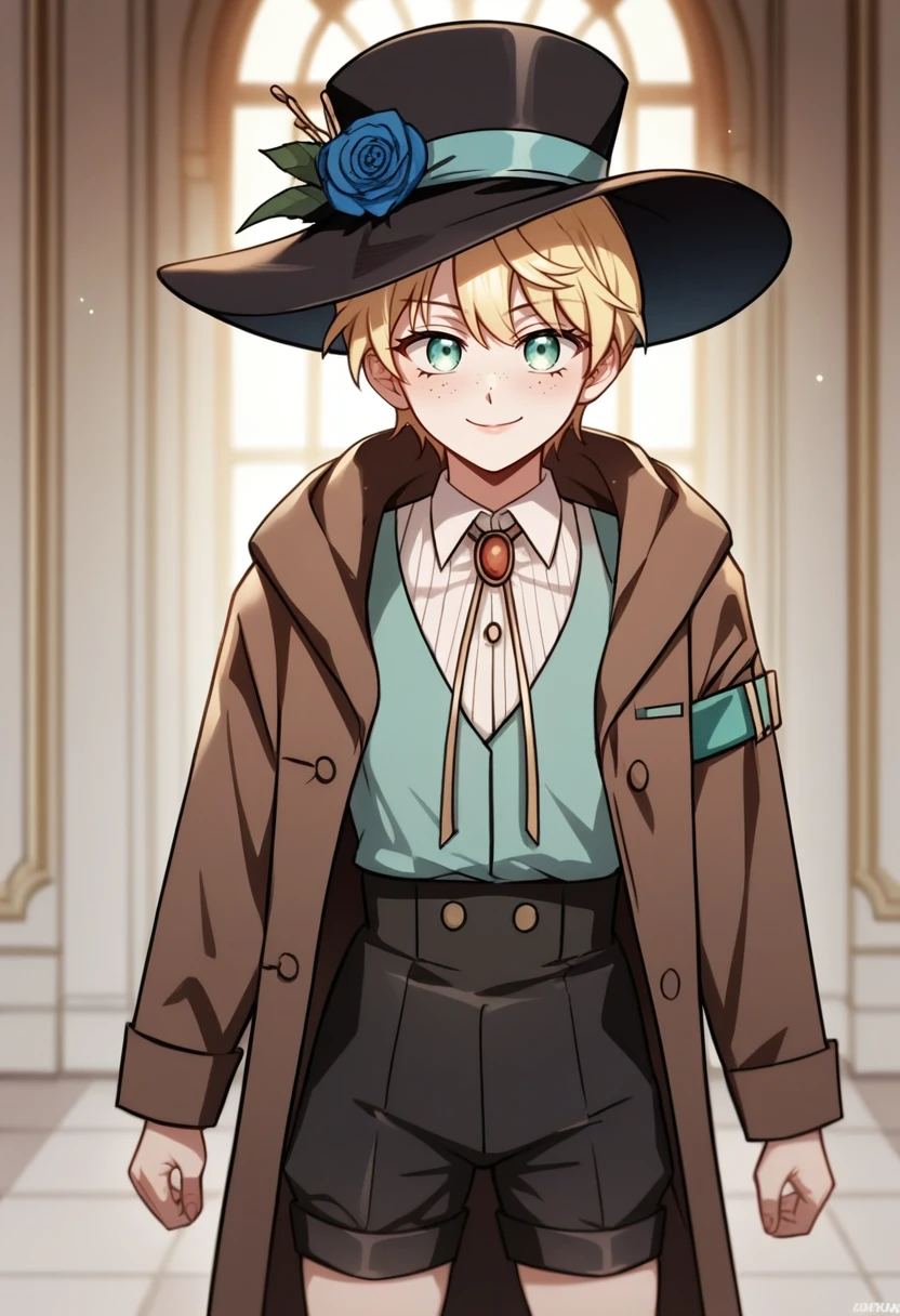 regressor_manual, Max, emerald eyes, blonde hair, freckles, white vest, black shirt, necktie, white shorts, / ,puffy shorts, robe, top hat, vest, white shirt,