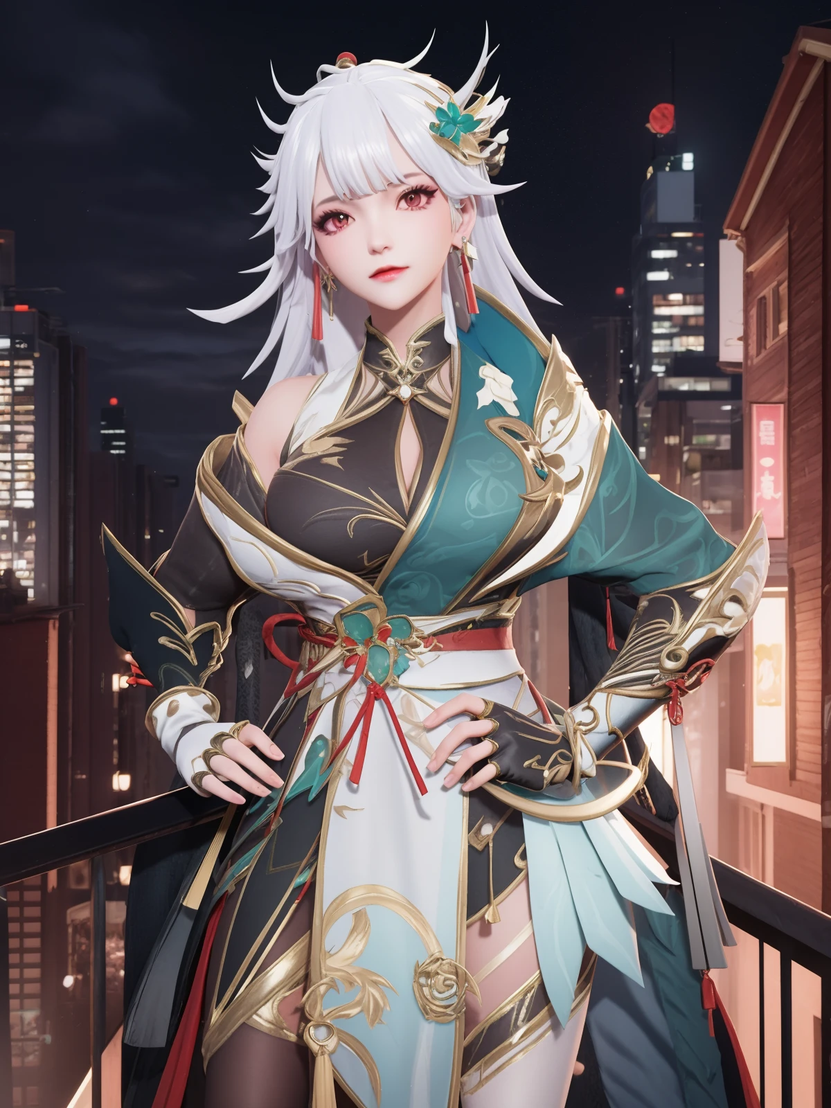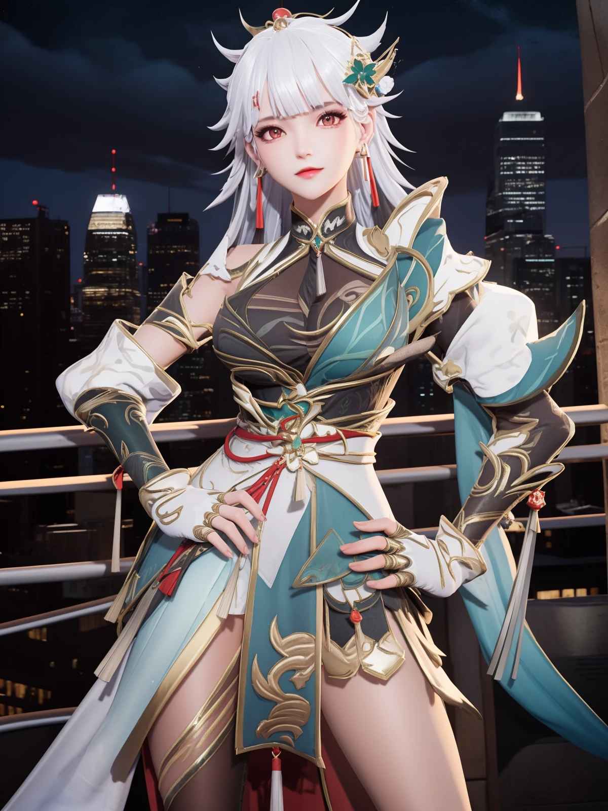 WZRYyunyingHGSX, 1girl, solo, jewelry, earrings, full body, high heels, white hair, hair ornament, gloves, looking at viewer, thighhighs, tassel, dress, asymmetrical legwear,cityscape, night,hand on hip,