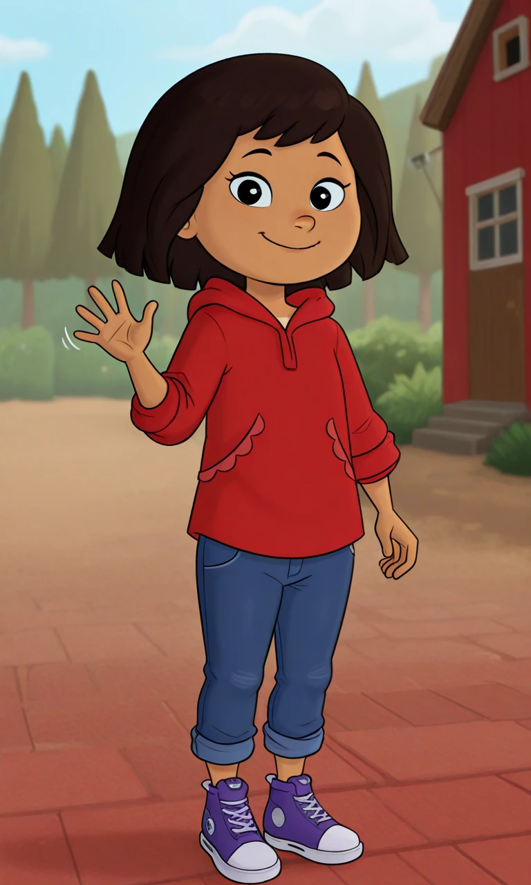molly_mabray,tan skin,short hair, straight hair, dark brown hair,red summer kuspuk,blue cuffed jeans,purple high top sneakers